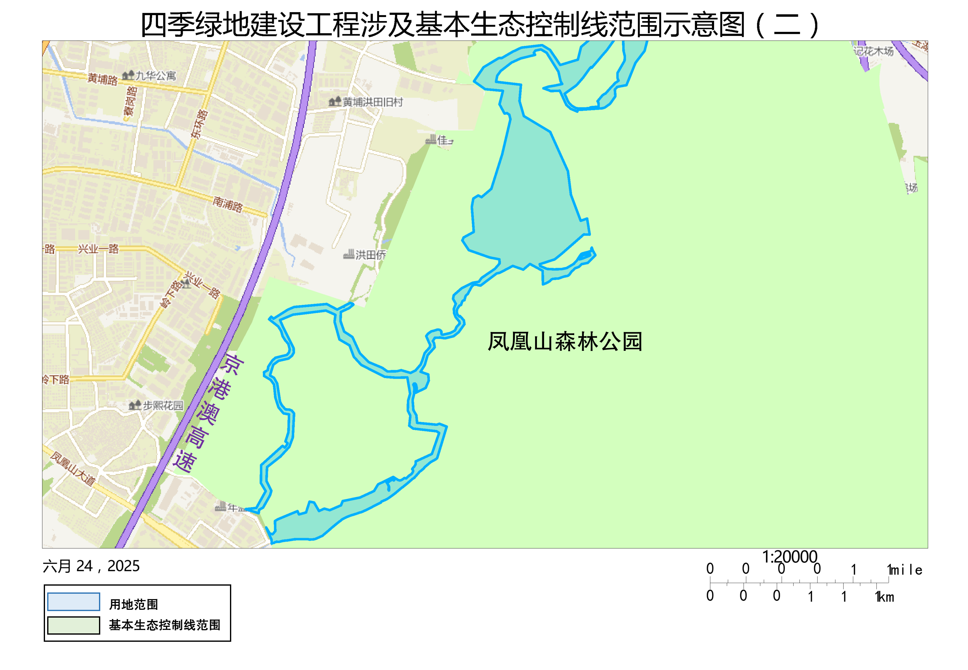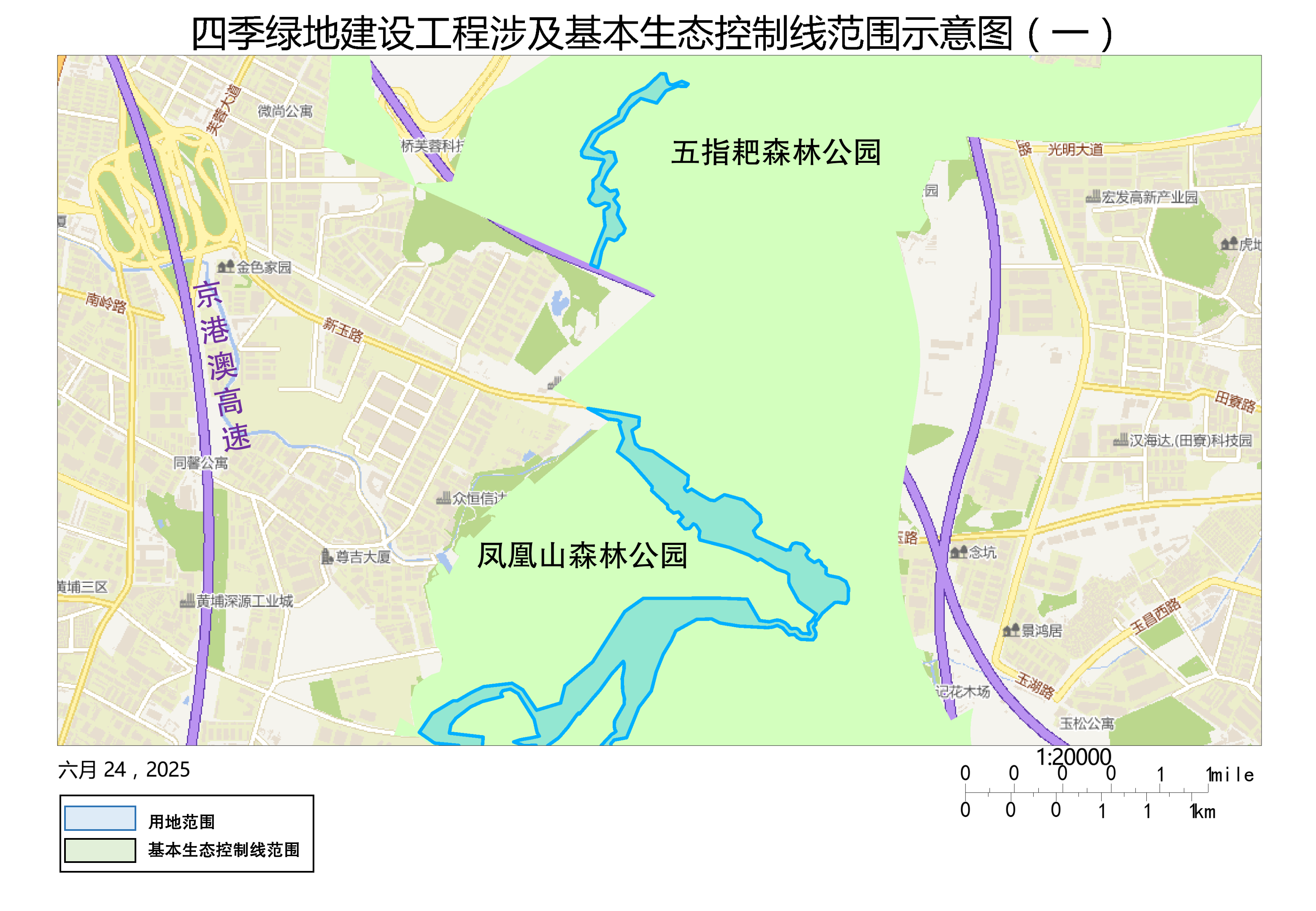 四季绿道建设工程项目横跨深圳市宝安区福永街道、新桥街道、松岗街道,建设范围依托省立绿道2号线,南起于凤凰山大道与福凤路交叉口,串联屋山水库、七沥水库、凤岩水库(矿坑)、长流陂水库,跨新玉路、下穿外环高速,向北连接至五指耙水库,主线全长约12.1公里,支线长约3.9公里(含屋山水库、凤岩水库环线),该项目建设范围涉及凤凰山森林公园和五指耙森林公园,共有1314659.65平方米位于基本生态控制线范围内。