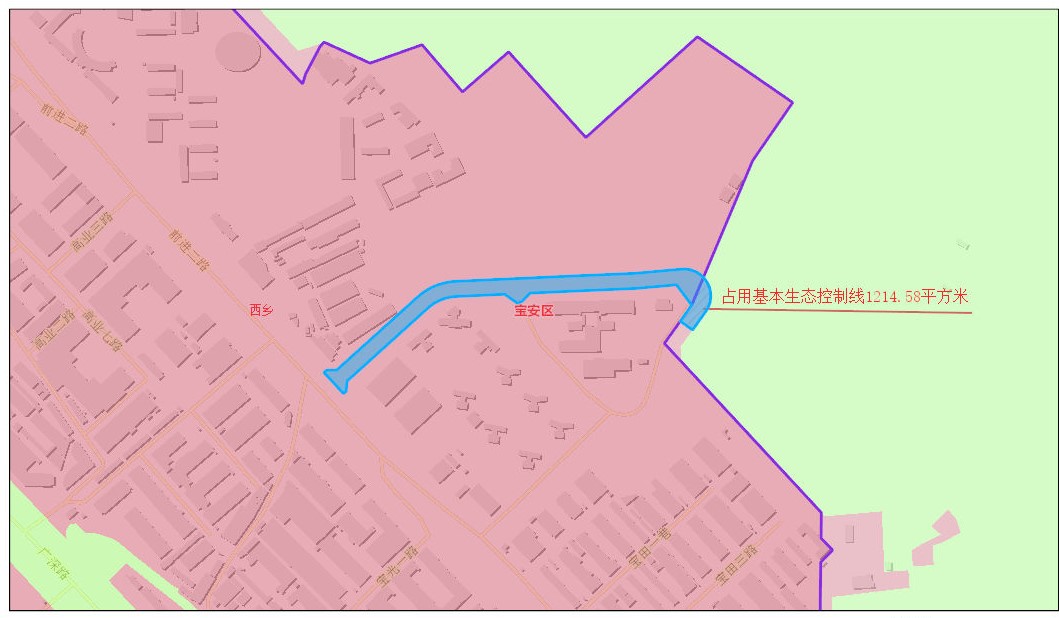宝安区西乡街道办事处来文办理西乡街道文教路(前进二路至拓展路)新建工程方案设计核查。项目申请用地位于西乡街道,约有1214.58平方米涉及基本生态控制线范围。