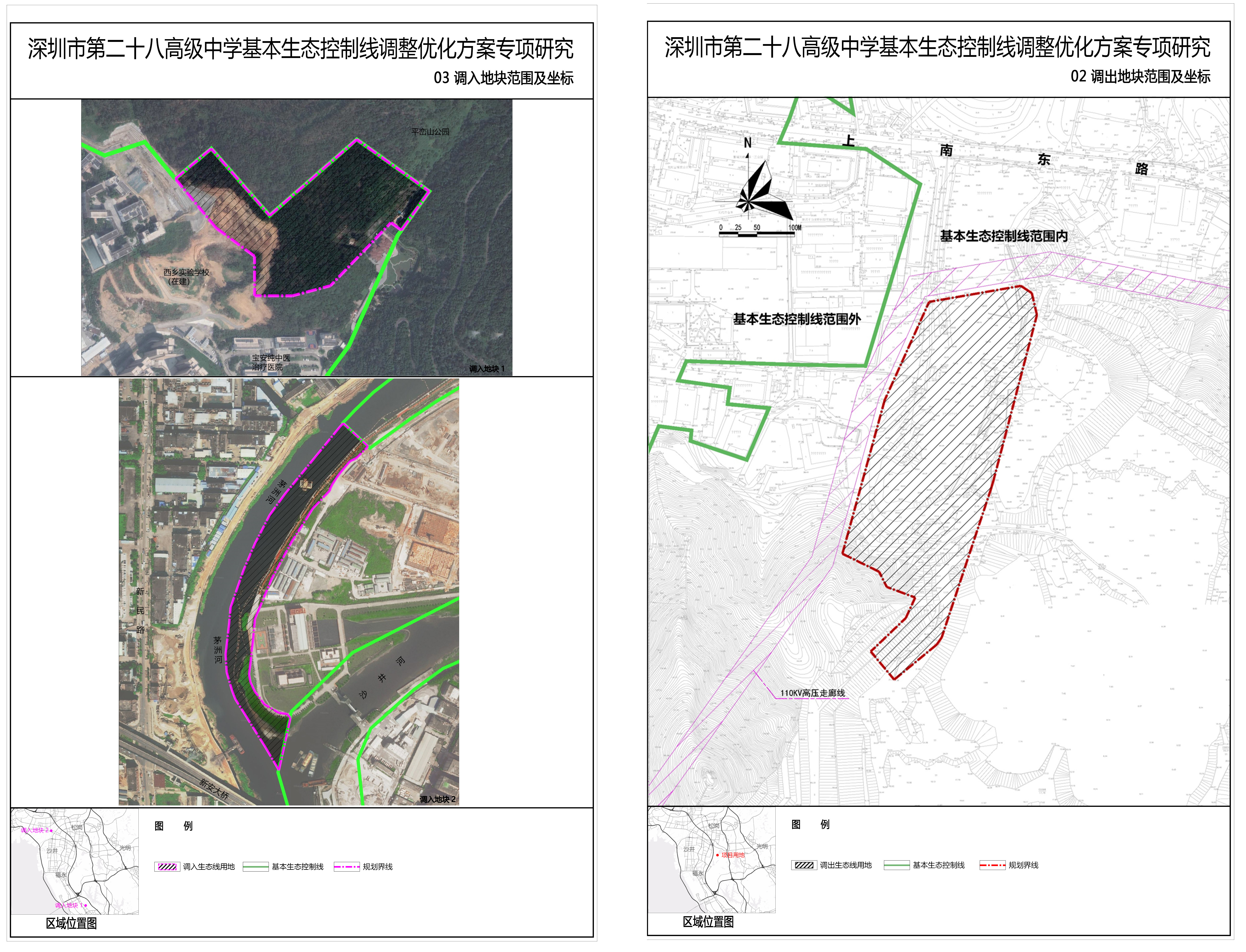 为推动深圳市第二十八高级中学项目建设,根据《深圳市基本生态控制线管理规定》(以下简称《管理规定》),深圳市规划和自然资源局宝安管理局按程序对该项目涉及的基本生态控制线范围进行优化调整,具体调整方案为:调出地块位于新桥街道东南部富城工业区东侧联发石场地块,用地面积约7公顷;调入地块1位于深圳市宝安103-17&15号片区[西乡平栾山、铁仔山片区]法定图则02-08地块内,用地面积约5.8公顷,其中有效调入面积约5.3公顷;调入地块2位于深圳市宝安203-01&202-13号片区[松岗沙浦-江边地区]法定图则03-01地块内,为松岗车辆段地铁上盖物业项目中剩余指标,用地面积约4.9公顷,其中有效调入面积约1.8公顷。