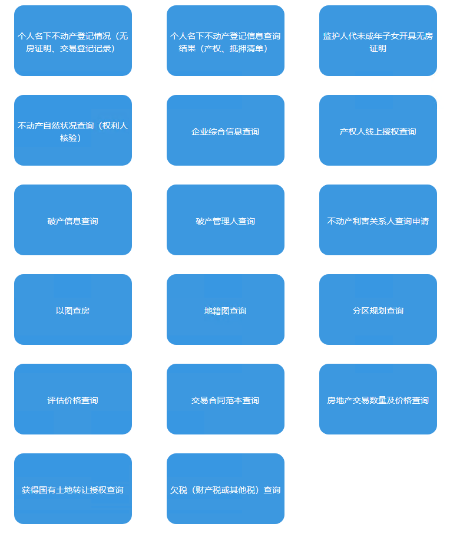 目前,平台共提供17个查询功能模块,除新增整合的上述9个查询功能模块外,保留了名下不动产登记情况(无房证明、交易登记记录)、名下不动产登记信息查询结果(产权、抵押清单)、破产管理人查询等涉及考查产权(所有权)、产权负担(抵押权)信息的查询功能模块。真正实现“一站式”尽职调查服务。