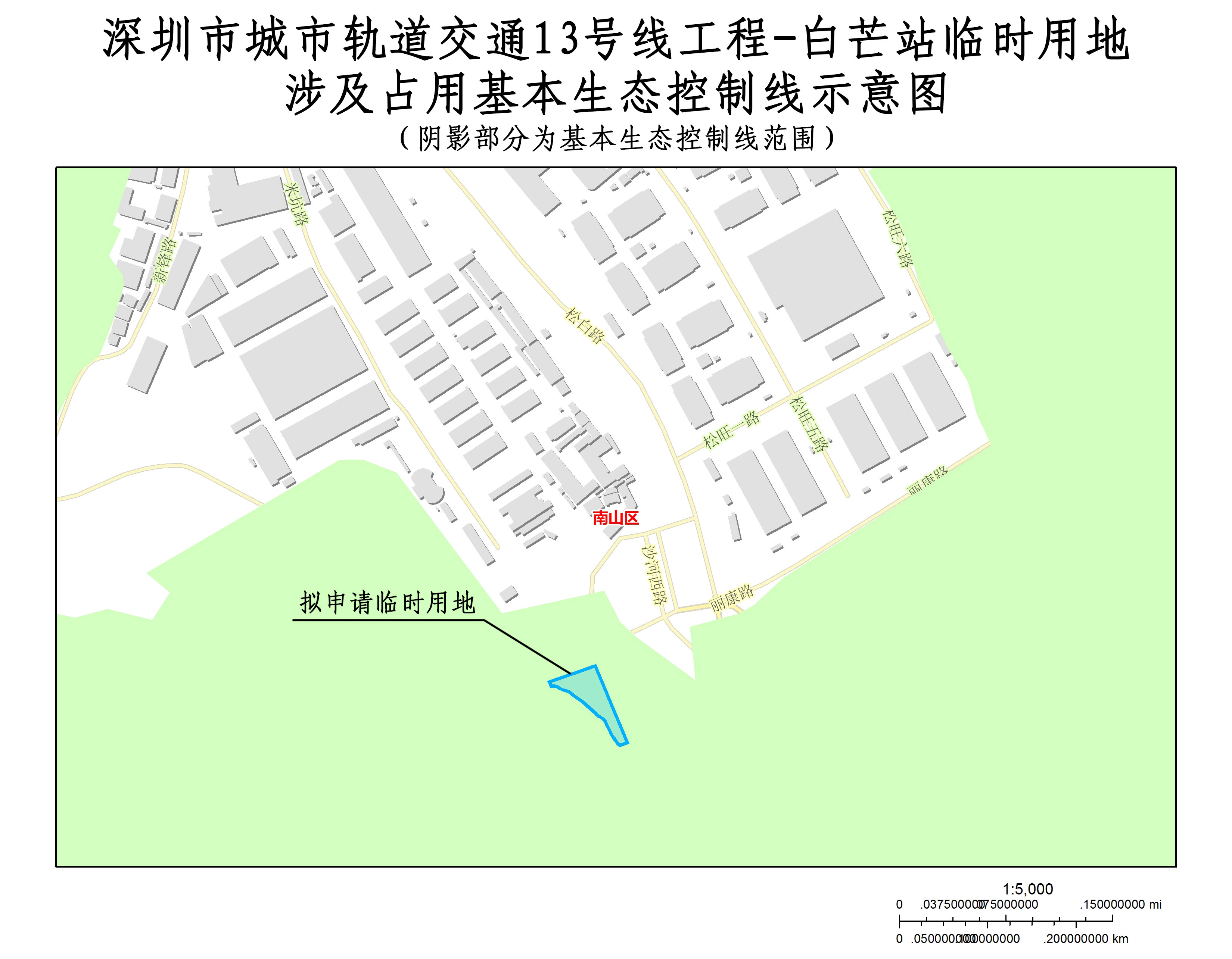 深圳市地铁集团有限公司和深圳市轨道交通建设指挥部办公室申请办理深圳市城市轨道交通13号线工程-白芒站工程的临时用地,深圳市规划和自然资源局南山管理局已受理。拟申请用地涉及占用基本生态控制线,根据《深圳市基本生态控制线管理规定》,为保障公众的知情权和参与权,现将项目申请临时用地占用基本生态控制线公示如下: