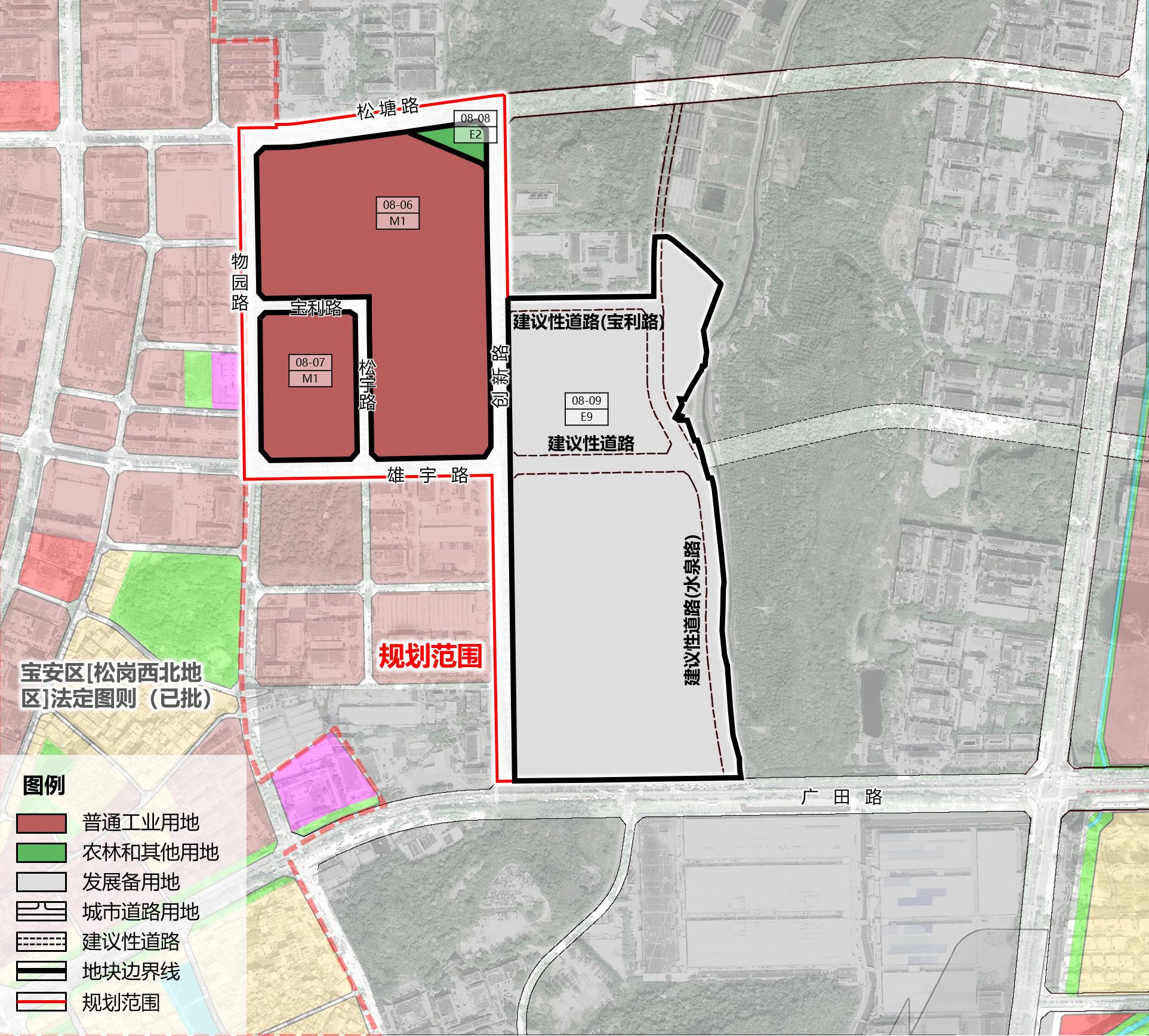 规划范围位于宝安区燕罗街道塘下涌社区,广田路北侧、物园路东侧、松塘路南侧,用地面积为542002平方米,拟规划为普通工业用地、农林和其他用地、发展备用地和道路用地。