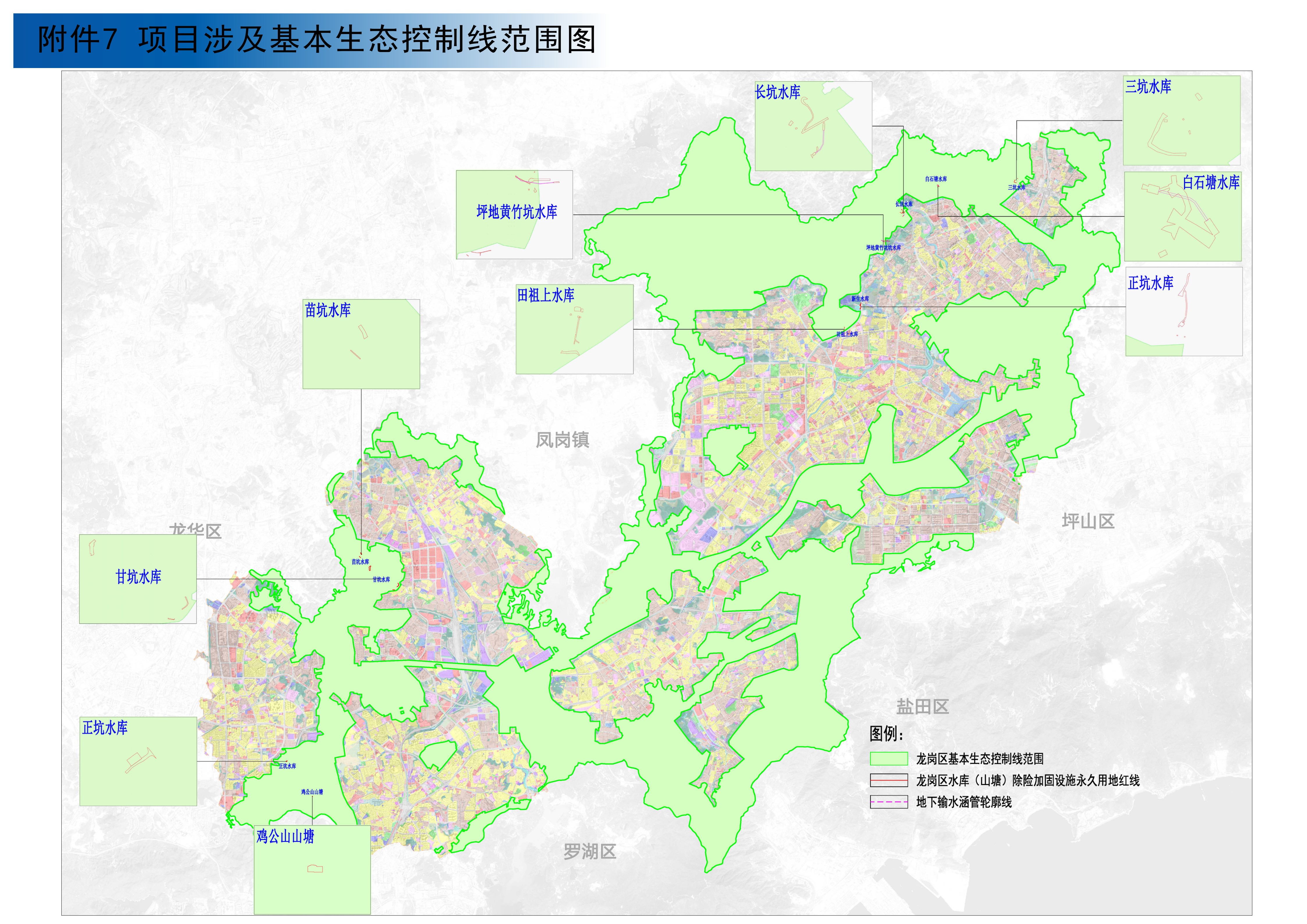 按照省、市政府相关工作部署,推进水库除险加固工程建设具有必要性和紧迫性。除石豹水库和猪锣皮水库外,龙岗区正在开展36座水库(山塘)除险加固工程,其中12座水库(山塘)的配建设施用地位于法定图则未覆盖区域。根据相关要求及工程进度,深圳市龙岗区水务局委托编制了坪地黄竹坑水库、白石塘水库、长坑水库、三坑水库、新生水库、田祖上水库、正坑水库、甘坑水库、苗坑水库、鸡公山山塘等10座水库(山塘)的除险加固配建设施选址及规划设计条件、基本生态控制线占用方案研究。目前项目成果已于2024年5月13日通过深圳市规划和自然资源局业务会审议,现依据《中华人民共和国城乡规划法》《深圳市城市规划条例》《深圳市控制性详细规划“一张图”成果及数据汇交标准技术指引(试行)》和《深圳市基本生态控制线管理规定》等相关法规对成果进行公示: