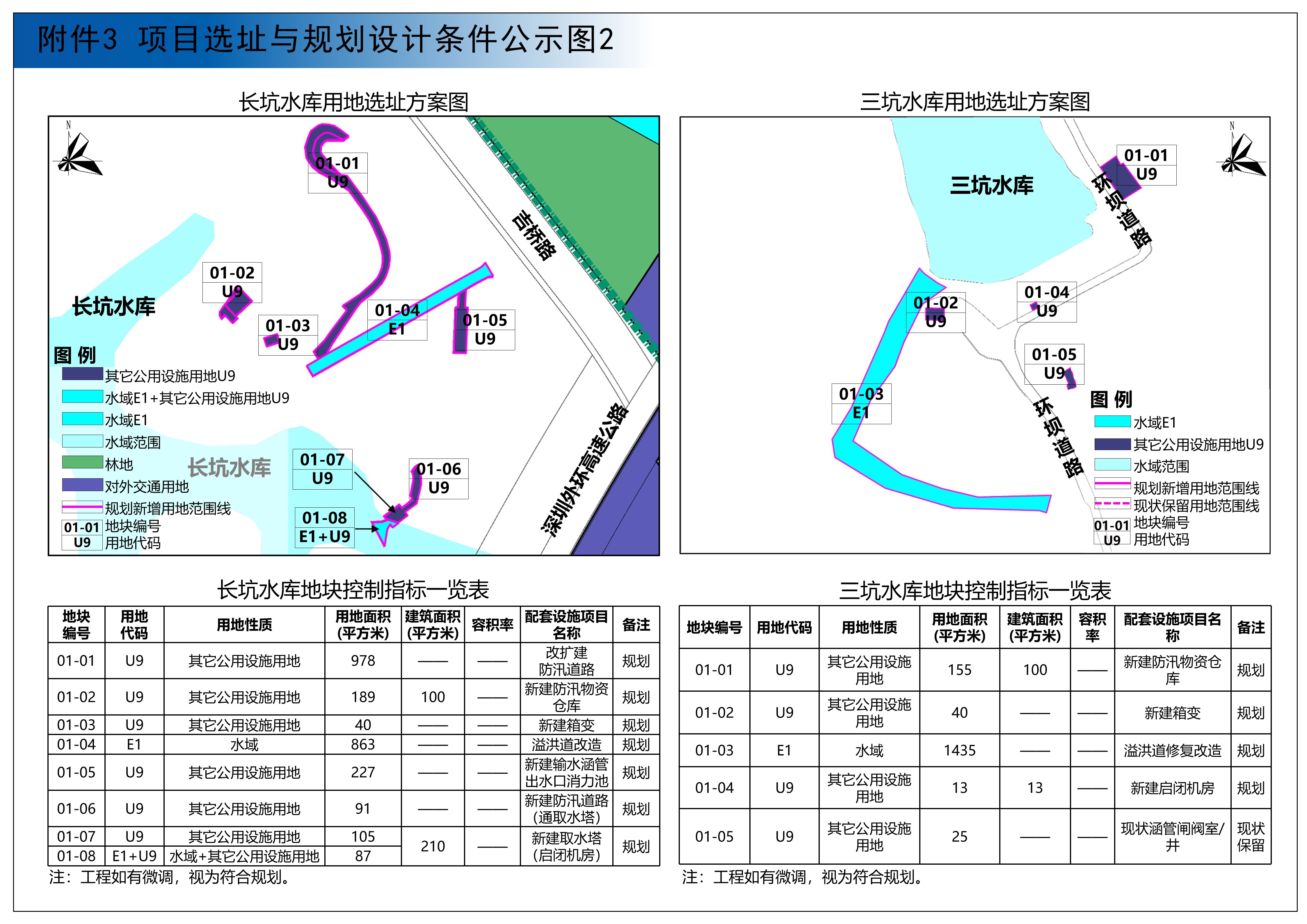 1.选址方案:龙岗区三坑水库除险加固工程配套设施选址总用地面积为1668平方米,包括新建防汛物资仓库、箱变,拆除重建启闭机房,溢洪道修复改造和现状涵管闸阀室/井等设施。