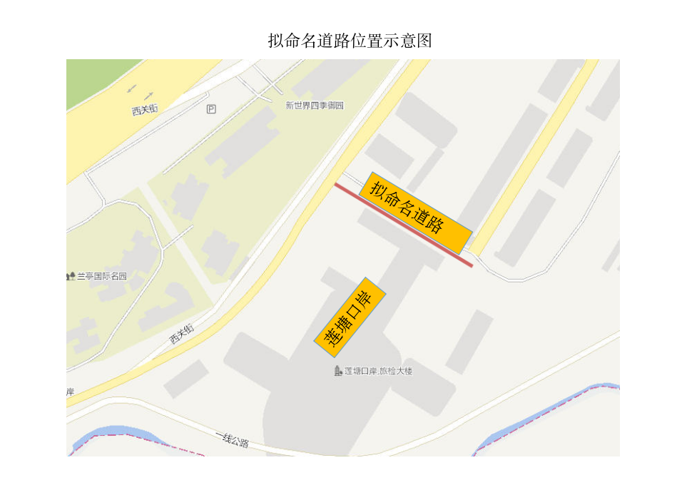 拟命名道路位于莲塘口岸东侧,为口岸二层平台外围通道,长约130米,宽约12米,拟命名方案为“莲强路”。