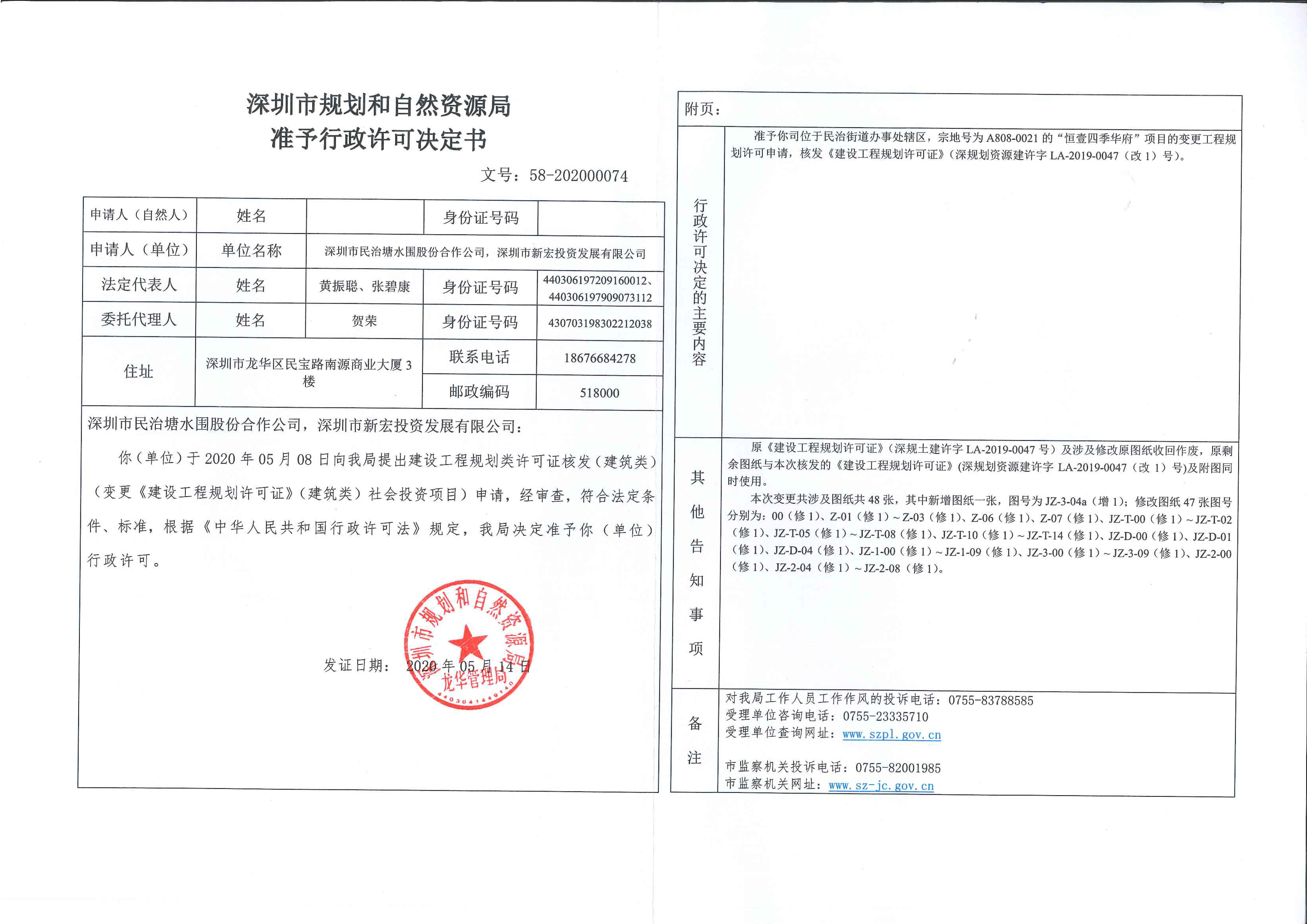 经深圳市规划和自然资源局龙华管理局审查,同意核发项目《建设工程规划许可证》(深规划资源建许字LA-2019-0047(改1)号)。根据《中华人民共和国城乡规划法》第四十条的规定,现将本次核发的《建设工程规划许可证》及总平面图予以公布。