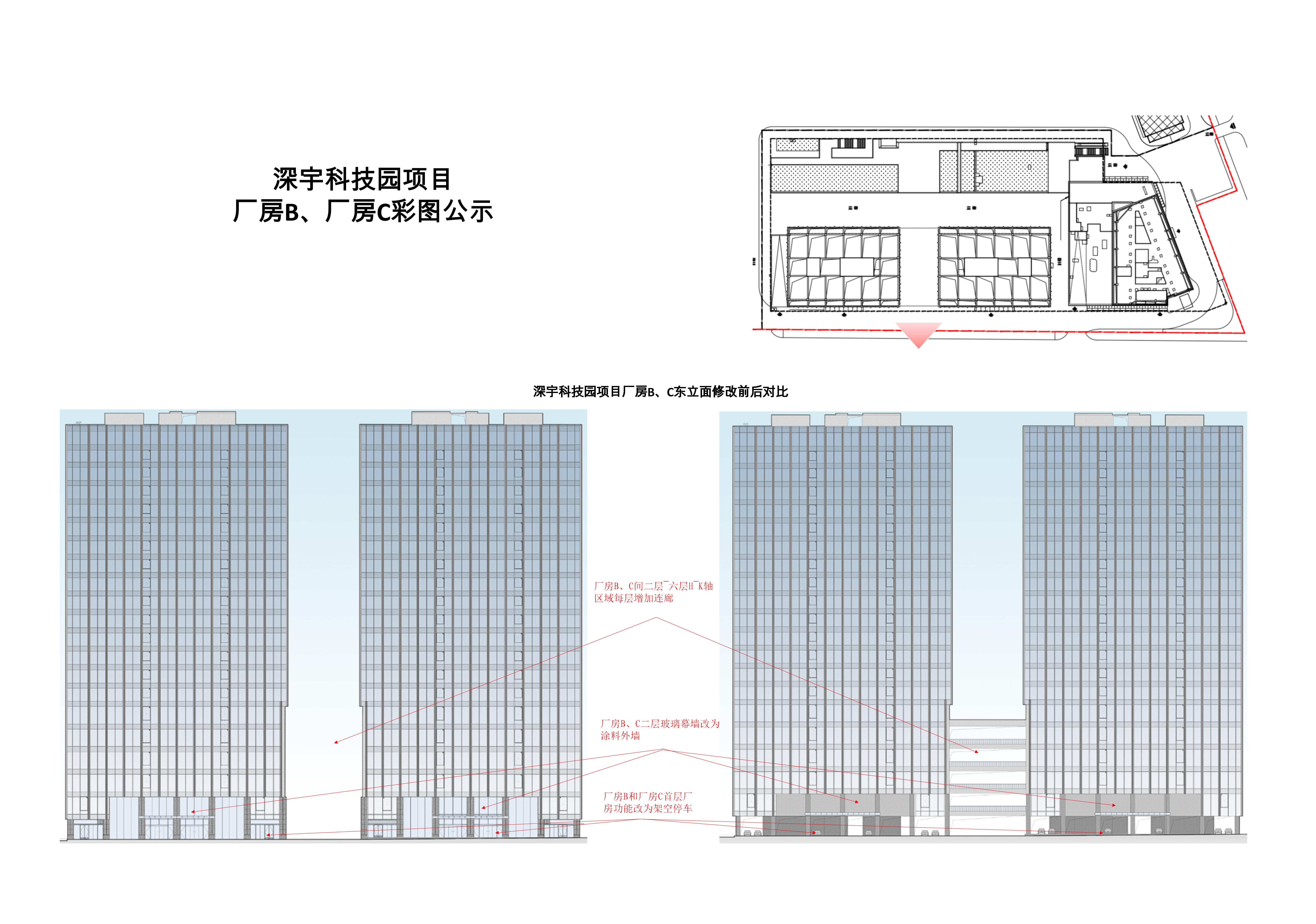 深圳市深宇置业控股有限公司开发建设的“深宇科技园”项目(宗地号:G13111-0110)位于坪山区坑梓街道办事处聚龙山片区(锦绣中路与兰景路交汇处东南角),用地面积为55572.52平方米。该项目于2021年3月25日取得《建设工程规划许可证》(深规土建许字PS-2018-0002改2号)。因企业使用需求,项目进行优化设计,根据《中华人民共和国行政许可法》《中华人民共和国城乡规划法》和《深圳市城市规划条例》等有关规定,具体修改公示如下: