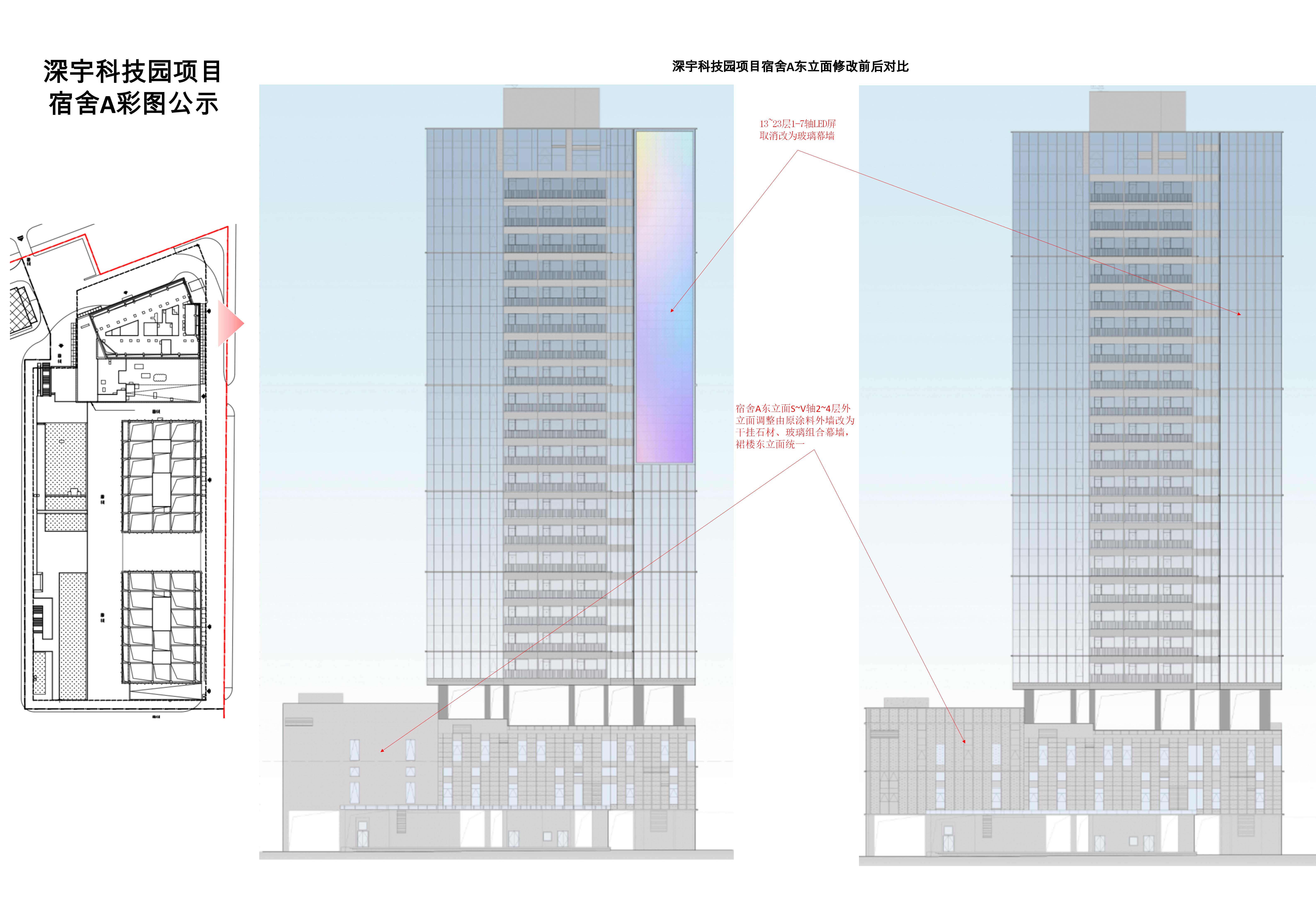 (二)宿舍A东立面S~V轴2~4层外立面调整由原涂料外墙改为干挂石材、玻璃组合幕墙,裙楼东立面统一。