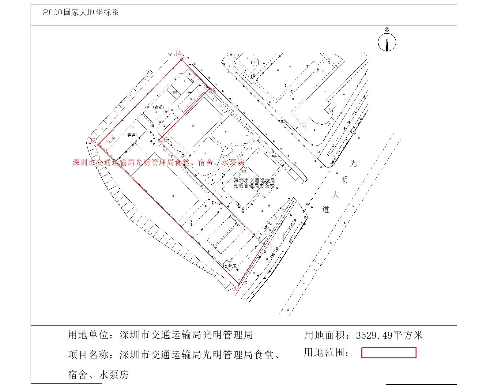 深圳市交通运输局光明管理局食堂、宿舍、水泵房物业已纳入市直及税务党政机关办公用房确权登记项目清单,现将深圳市交通运输局光明管理局提供的物业用地范围进行公示,后续我局将结合公示等相关情况开展土地确权工作。上述物业位于深圳市光明区光明大道505号,物业土地面积共计3529.49平方米(最终面积以土地权属证明文件为准),土地使用权人为深圳市交通运输局光明管理局,权属来源为行政划拨,现根据有关规定予以公示: