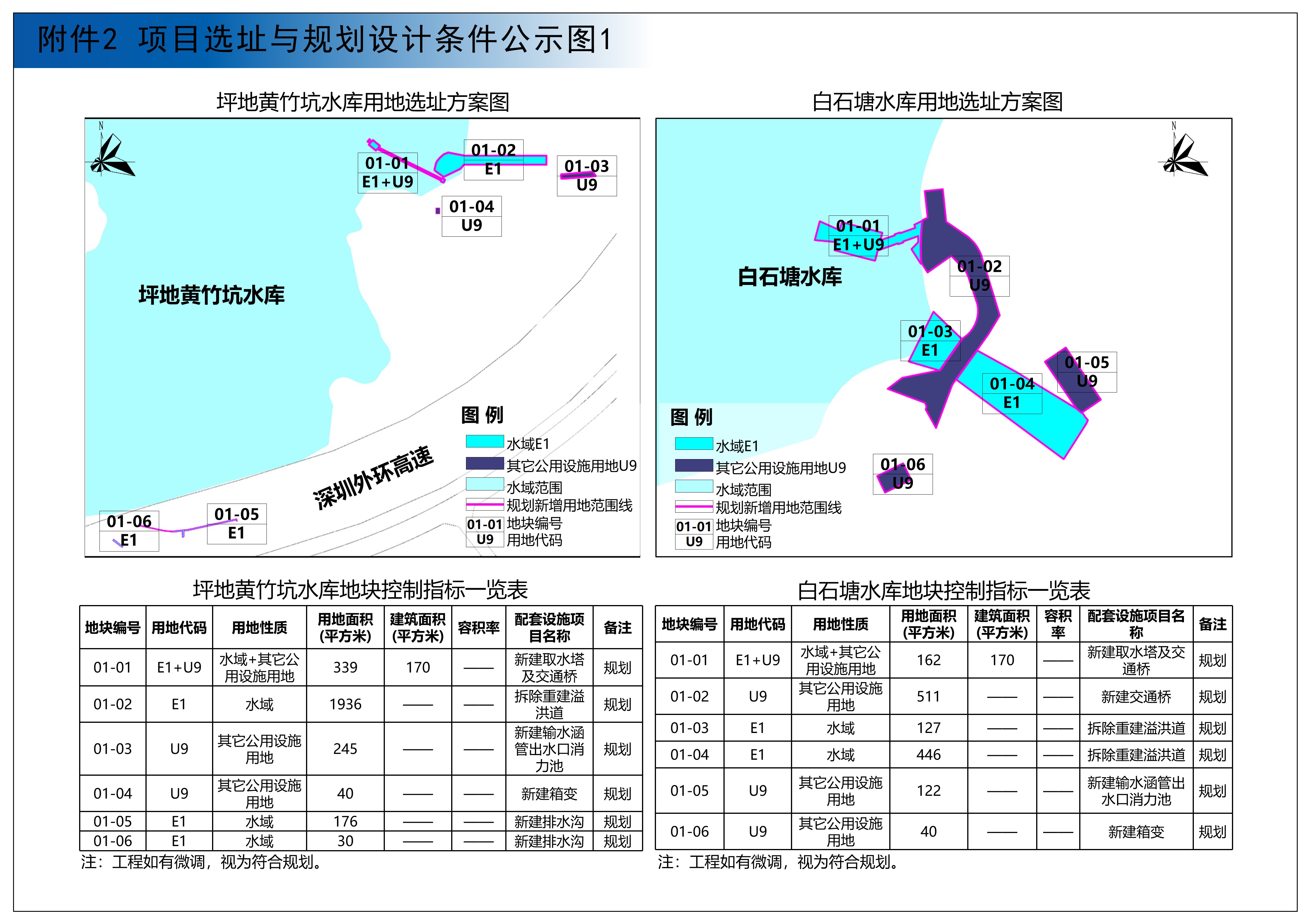 1.选址方案:龙岗区坪地黄竹坑水库除险加固工程配套设施选址总用地面积为2766平方米,包括新建取水塔及交通桥、输水涵管出水口消力池、箱变、排水沟和拆除重建溢洪道等设施。