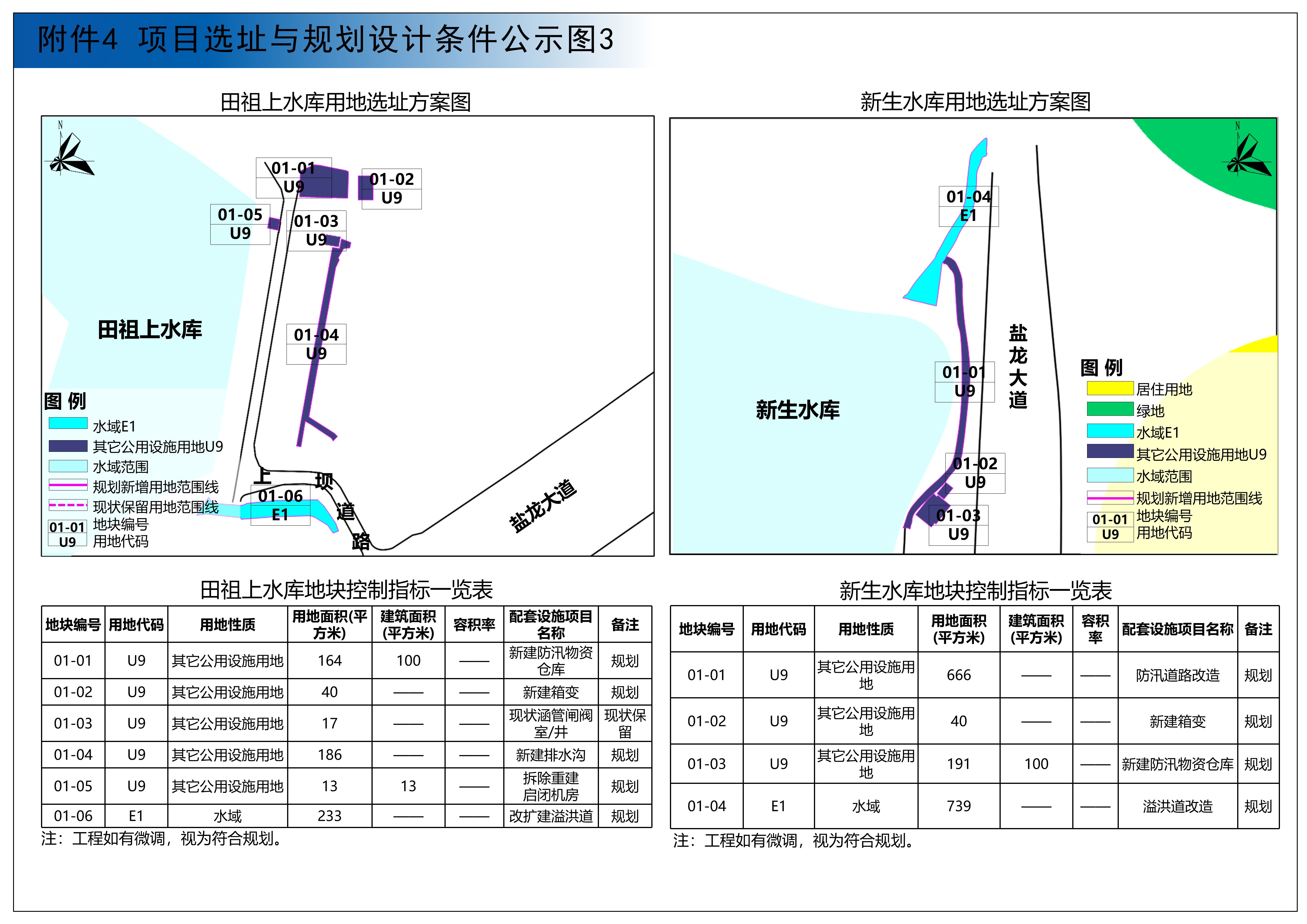 1.选址方案:龙岗区新生水库除险加固工程配套设施选址总用地面积为1635平方米,包括新建防汛物资仓库、箱变,拆除重建溢洪道、改扩建防汛道路等设施。