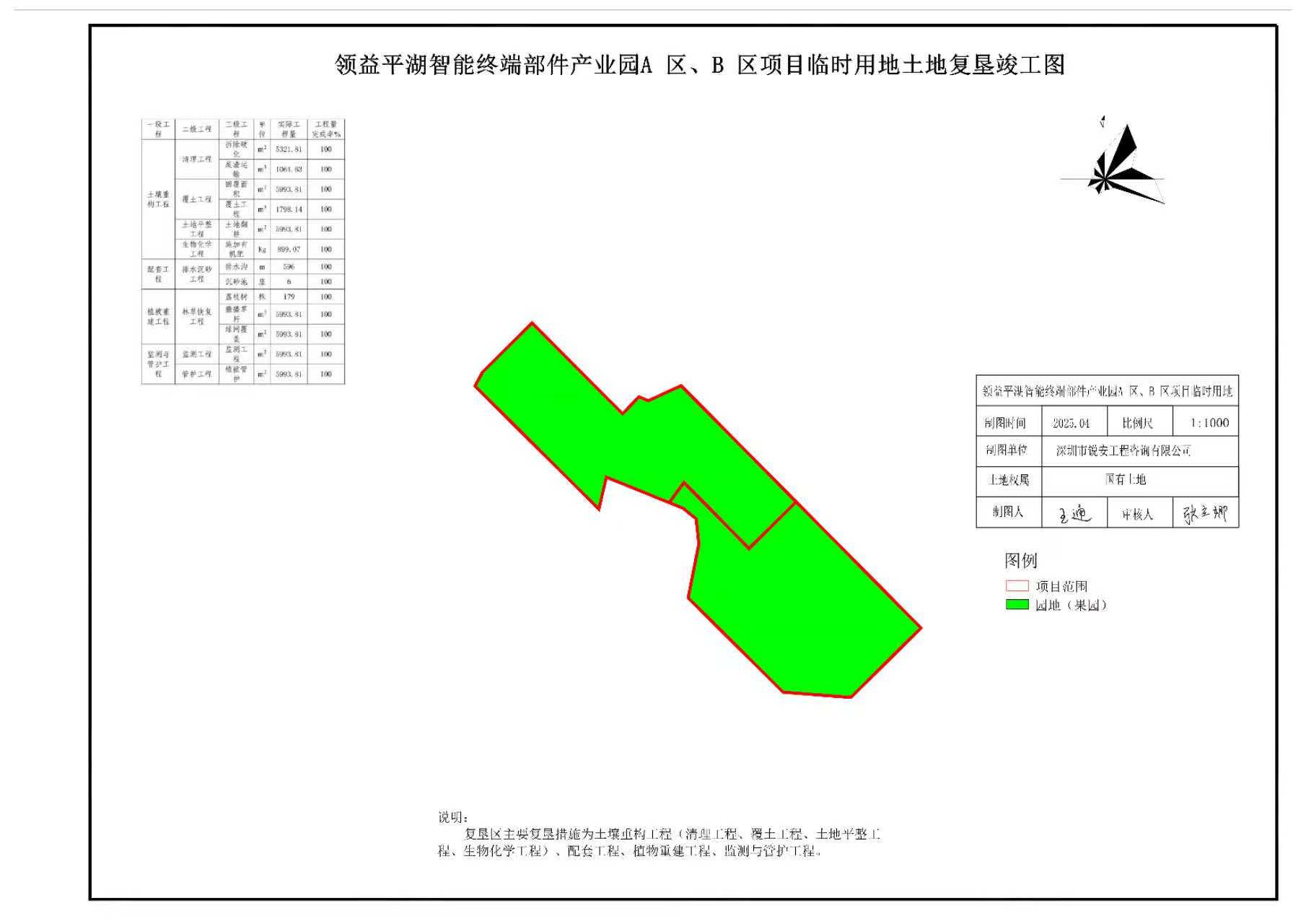 2025年6月27日,市规划和自然资源局龙岗管理局会同农业、林业、环境保护等有关部门及有关专家,对该临时用地复垦情况进行初步验收,原临时用地范围面积为5993.81平方米,复垦责任范围内已按批准的复垦方案、相关规程规范及有关规定完成了工程任务,复垦施工质量满足相关要求,复垦效果基本达到了复垦方案要求。
