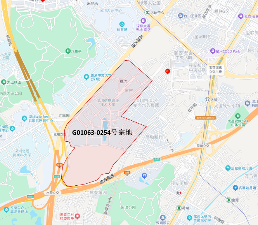(一)用地单位为深圳信息职业技术大学,用地位置为龙翔大道东南侧,宗地号G01063-0254,用地面积924934.47平方米,用地性质为教育设施用地,其中建设用地面积672112.17平方米,绿地面积252822.30平方米;规定容积率≤0.78;规定建筑面积519413平方米,已建建筑面积482793平方米,其中教育及配套辅助设施314149平方米,宿舍168644平方米;新建规定建筑面积36620平方米,其中宿舍34320平方米,6班幼儿园2200平方米(占地1800平方米),物业服务用房100平方米。