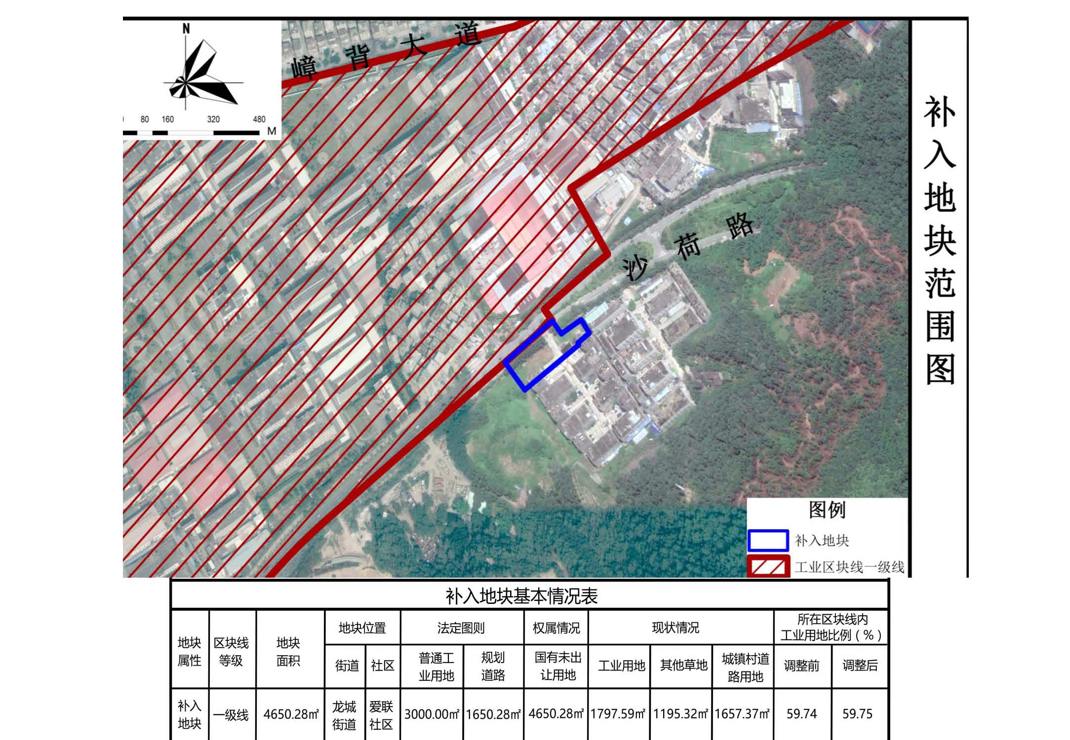 一、鹏利泰工业区城市更新单元规划方案调整区块线内工业用地面积3000平方米,为保证区块线完整性,本次对占用地块所在区块线不做调整,仅按要求调入工业区块线。调入地块共1块,面积4650.28平方米(其中工业用地面积3000平方米),位于龙岗区龙城街道。经核[南约地区]法定图则修编,调入地块规划用地性质为普通工业用地、道路用地。