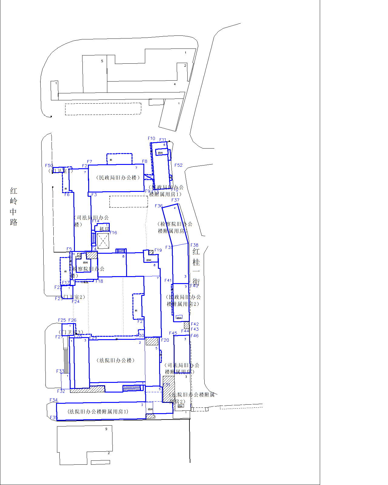 政法大楼位于罗湖区红岭中路(宗地H201-0100),拟规划确认总建筑面积22427.09平方米,地面以上建筑面积22260.93平方米(含01层通道建筑面积10.39平方米),地下室建筑面积166.16平方米。其中:法院旧办公楼6881.1平方米、地上8层、一至五层为办公及宿舍、六层至八层为办公;法院旧办公楼附属用房1为1651.78平方米、地上5层、一至二层为食堂及宿舍、三至五层为宿舍;检察院旧办公楼4066.85平方米、地上11层、一层、三至十一层为办公、二层为办公及食堂;检察院旧办公楼附属用房1235.27平方米、地上4层、为宿舍;民政局旧办公楼2441.13平方米、地上7层、为办公;民政局旧办公楼附属用房1为1487.30平方米、地上6层、地下1层、为办公;民政局旧办公楼附属用房2为507.34平方米、地上3层、一层为食堂、二层至三层为办公;司法局旧办公楼3029.19平方米、地上7层、为办公;司法局旧办公楼附属用房485.75平方米、地上3层、一层为宿舍、二层至三层为办公;机房31.08平方米、地上1层;门卫室1为14.99平方米、地上1层;门卫室2为35.96平方米、地上1层;门卫室3为36.6平方米、地上1层。
