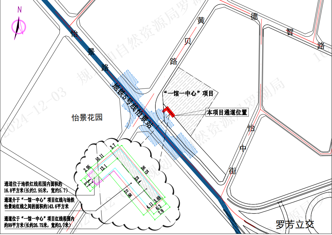 通道位于罗湖区“一馆一中心”项目西南侧,形状呈倒“L”型,西接地铁5号线怡景站负一层,东接“一馆一中心”项目负一层下沉广场。通道总面积约259.4平方米,其中,位于地铁红线内面积约16.8平方米(长约2.95米,宽约5.7米);位于“一馆一中心”项目用地红线内面积约99平方米(长约26.75米,宽约3.7米);通道介于“一馆一中心”项目红线与地铁怡景站红线之间的面积约143.6平方米。