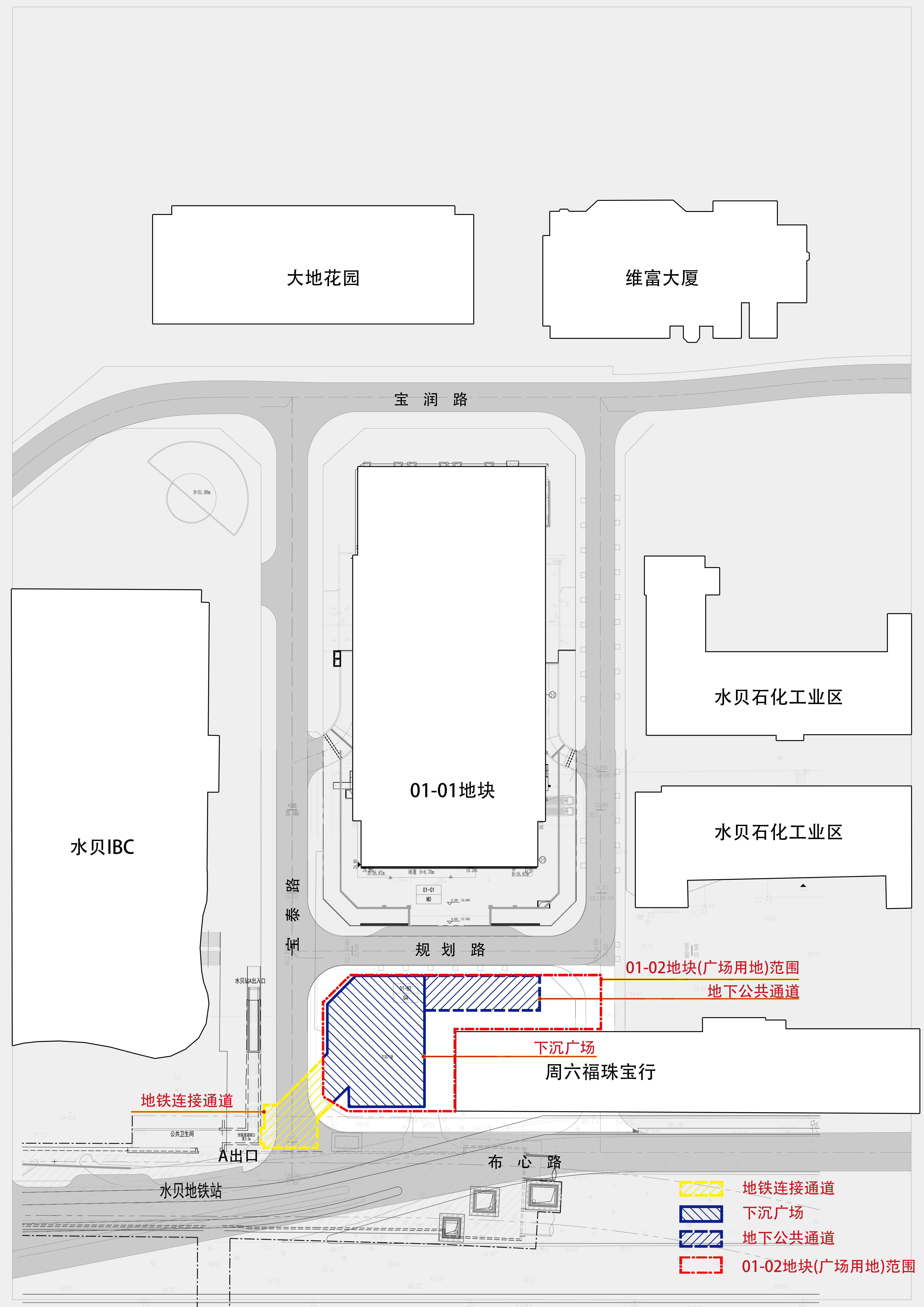 2、地铁连接通道规划方案如下:东侧接01-02地块广场,西侧接地铁3号线水贝站A出入口,全长约20.3米,通道净宽约为8.0-9.2米,通道净高约为5.5米,用地面积约为209.3平方米。(详见附图)