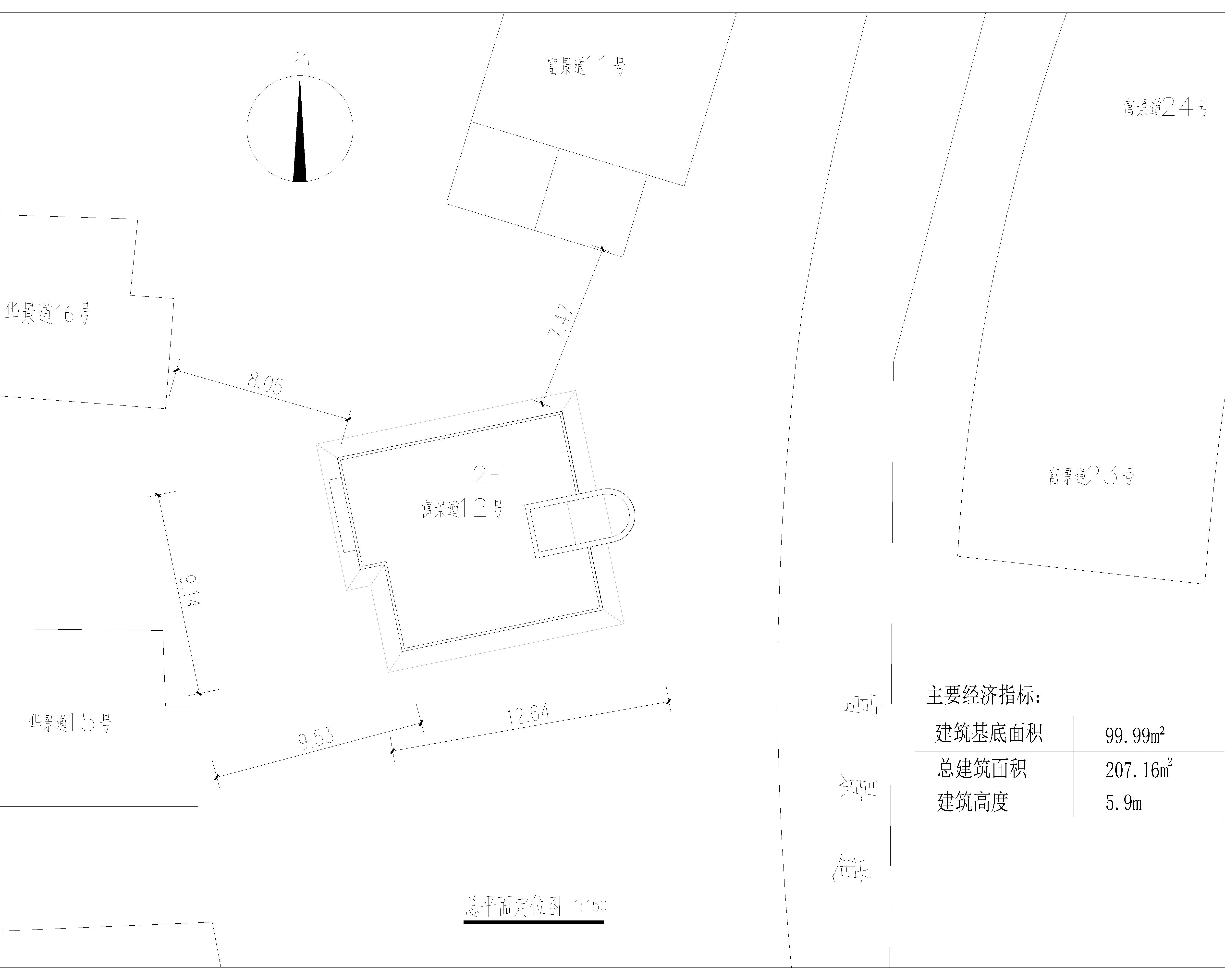 总建筑面积207.16平方米,建筑层数2层,建筑高度5.9米,建筑基底面积99.99平方米,重建建筑功能为原功能不变。