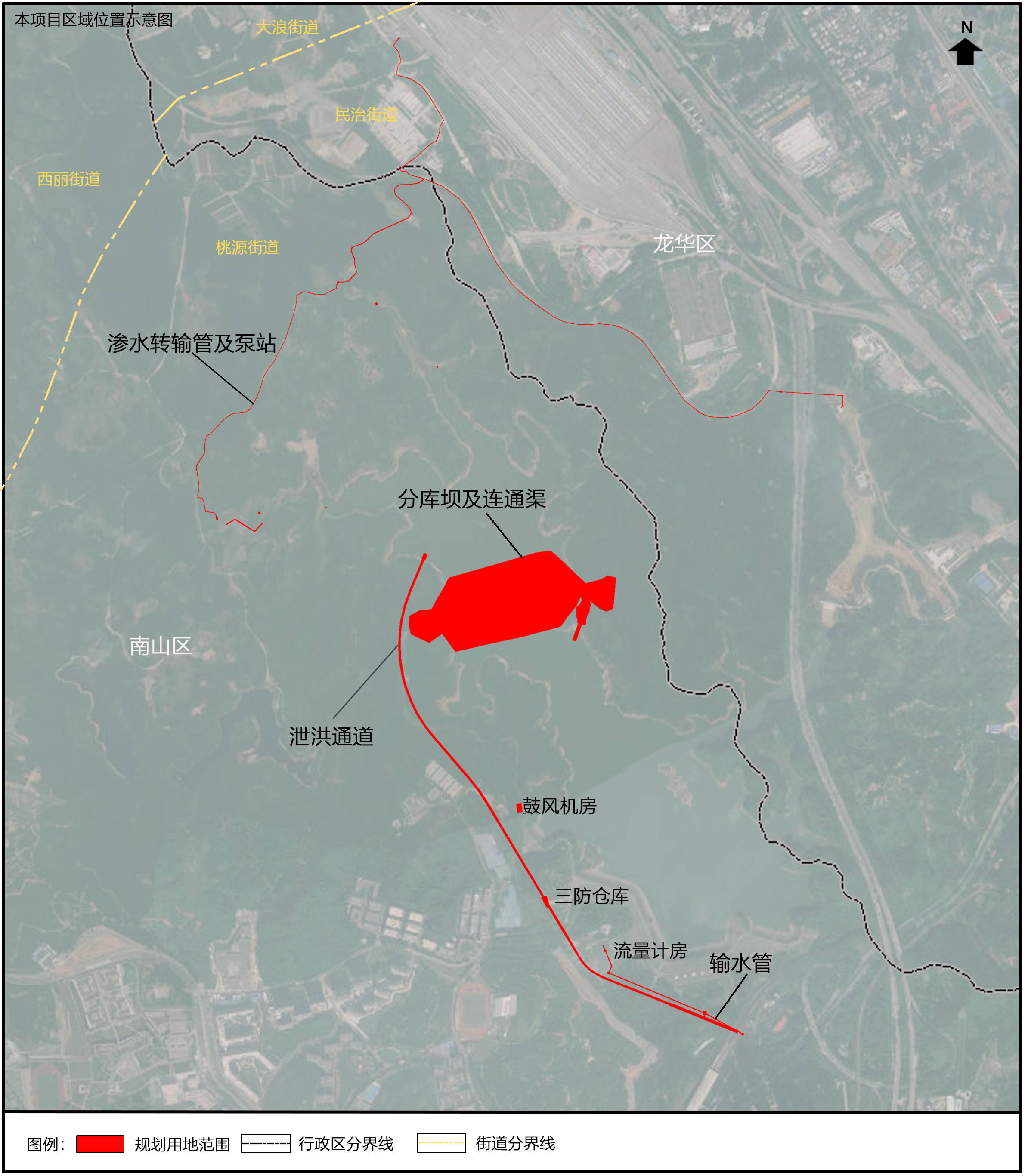 长岭皮水库综合治理工程拟选址于南山区桃源街道和龙华区民治街道的留仙大道以北,总用地面积14.08公顷。其中约0.09公顷位于龙华区,其余位于南山区。