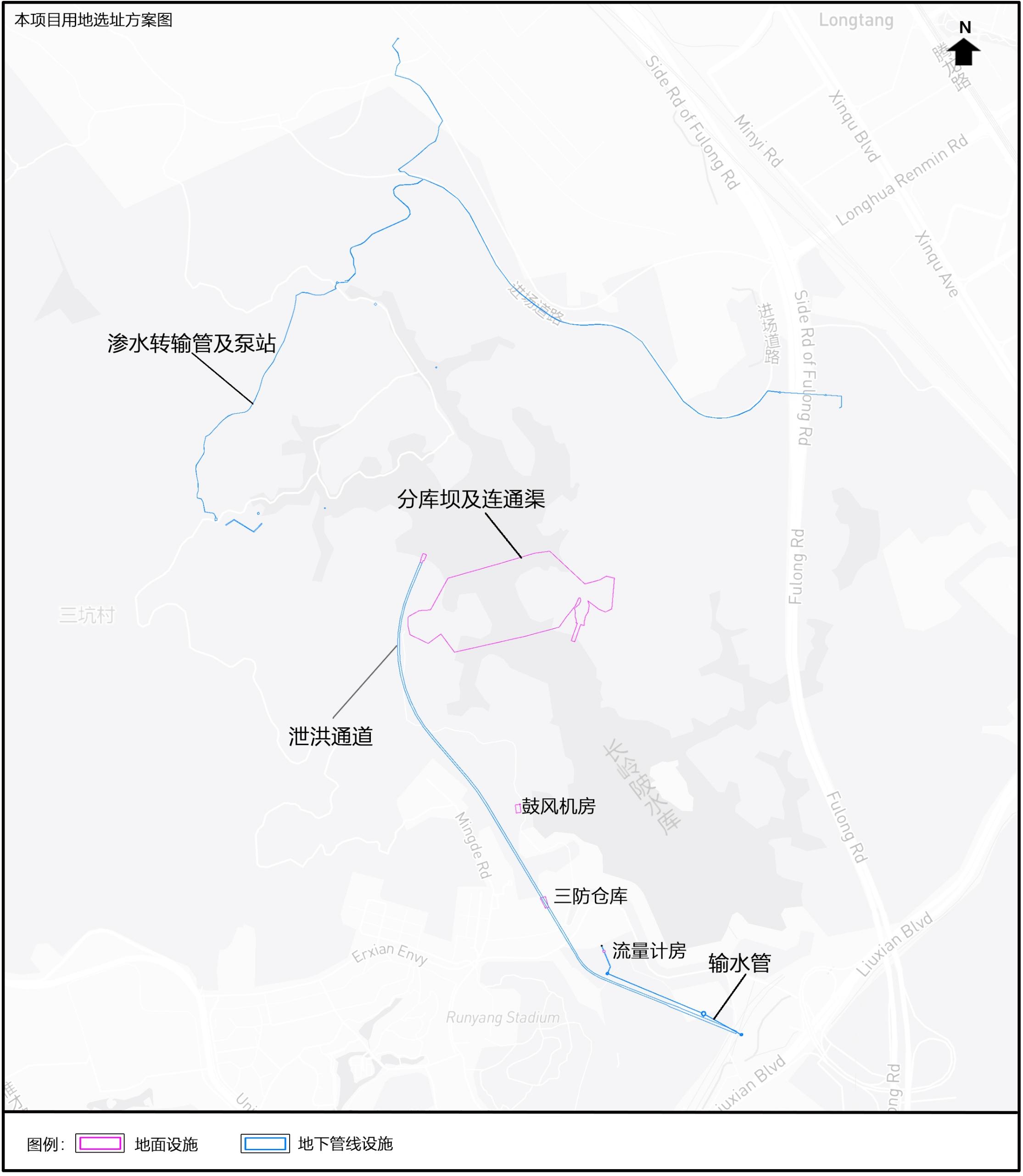 (四)渗水转输管及泵站工程:总用地面积2135.58平方米、建设内容:(1)渗水转输管:DN300的转输管长度为2.26公里;DN400的转输管长度为长度2.33公里,总长度约4.59公里,其中龙华区2.28公里,南山区2.31公里;(2)7处地下泵站:总面积129平方米,单座泵站面积12-30平方米,其中南山区5处,龙华区2处,建设形式为地下式。