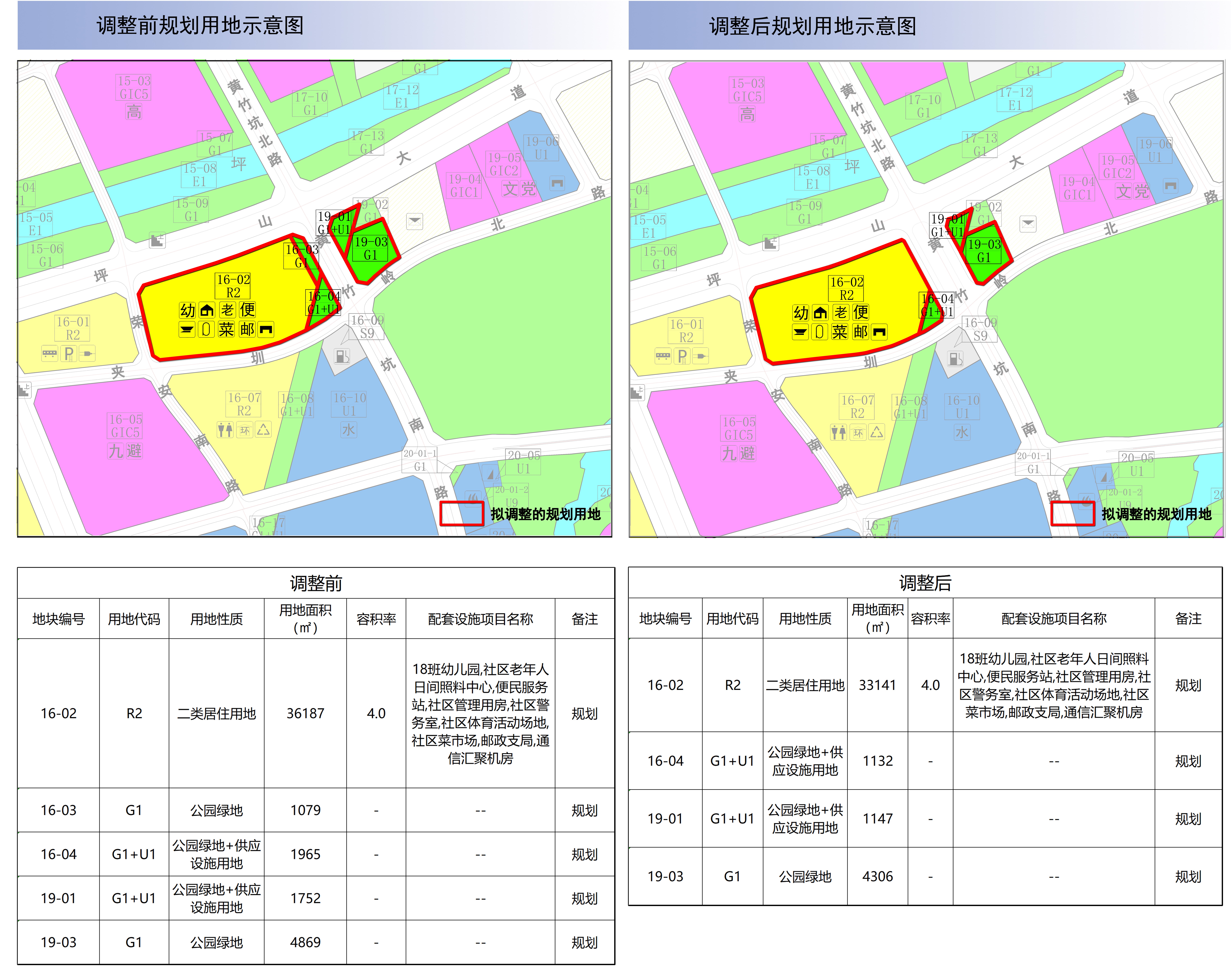 将16-03地块调整为道路用地;16-02地块用地面积调整为33141㎡,用地性质为二类居住用地(R2),容积率为4.0,配建18班幼儿园、社区老年人日间照料中心、便民服务站、社区管理用房、社区警务室、社区体育活动场地、社区菜市场、邮政支局、通信汇聚机房;16-04、19-01地块用地面积分别调整为1132㎡、1147㎡,用地性质均为公园绿地+供应设施用地(G1+U1);19-03地块用地面积调整为4306㎡,用地性质为公园绿地(G1)。以上地块备注均为规划。