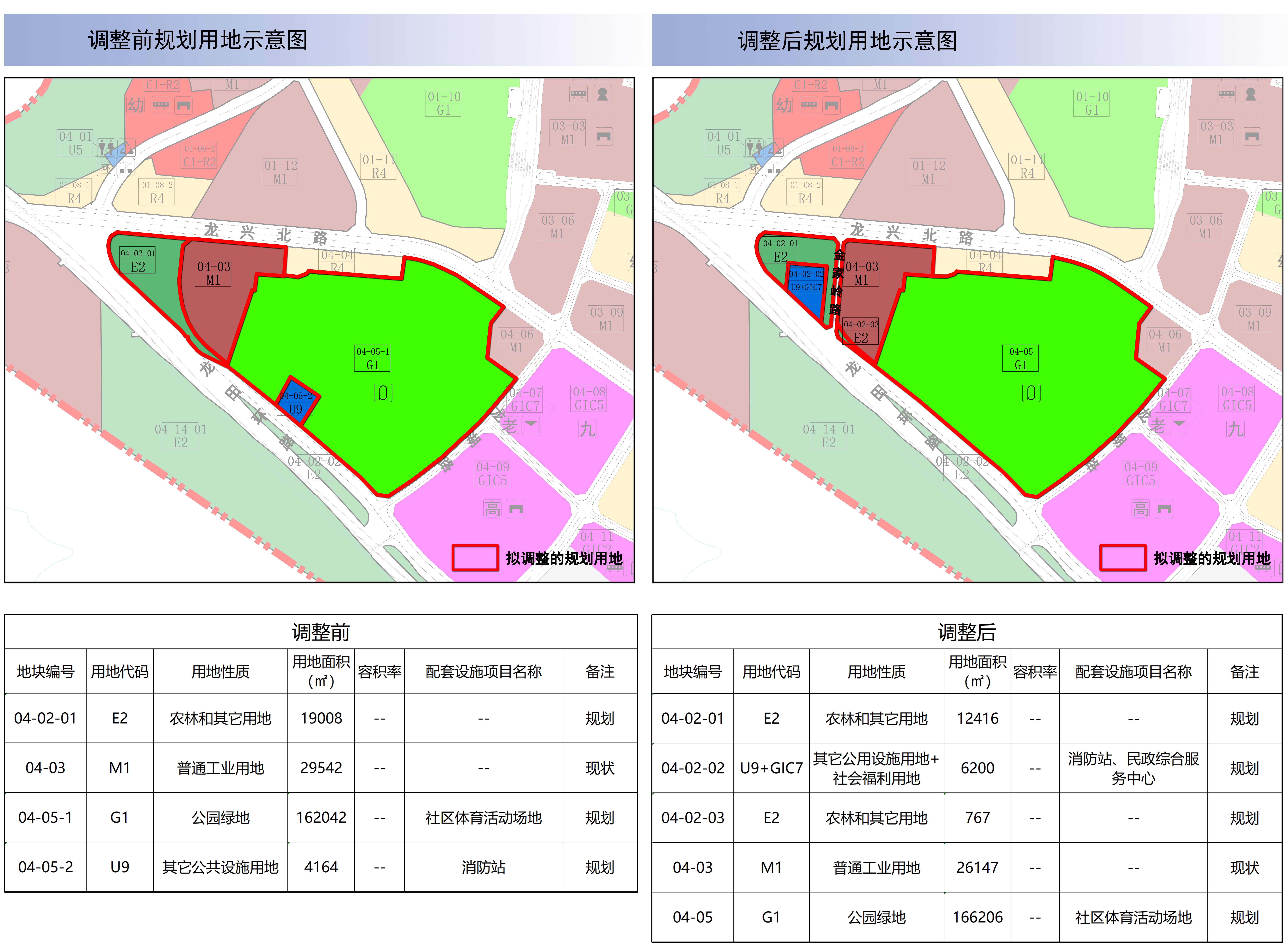 (一)04-02-01地块调整为04-02-01、04-02-02 04-02-03三个地块,04-02-01地块用地面积为12416㎡;04-02-03地块用地面积为767㎡,用地性质维持农林和其他用地不变;04-02-02地块用地面积为6200㎡,用地性质调整为其它公用设施用地+社会福利用地(U9+GIC7),建设消防站、民政综合服务中心,以上备注均为规划;04-03地块用地面积调整为26147㎡,其余指标保持不变;04-05-1地块与04-05-2地块合并为04-05地块,用地面积为166206㎡,用地性质调整为公园绿地(G1),配套设施为社区体育活动场地,备注为规划。