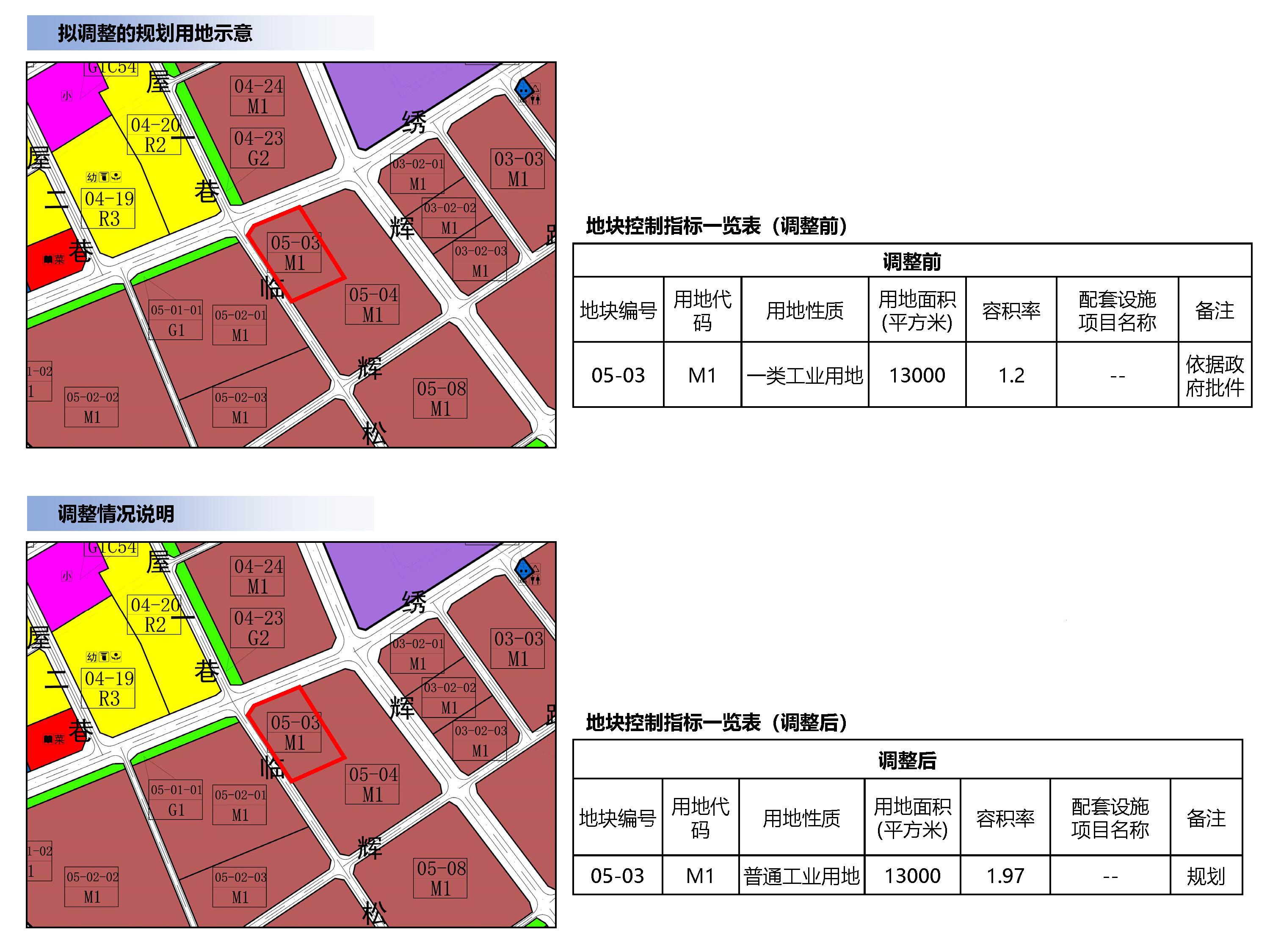 拟对金沙地区05-03地块进行调整,调整后,05-03地块规划用地面积为13000㎡,规划用地性质为普通工业用地(M1),容积率为1.97,备注:规划。