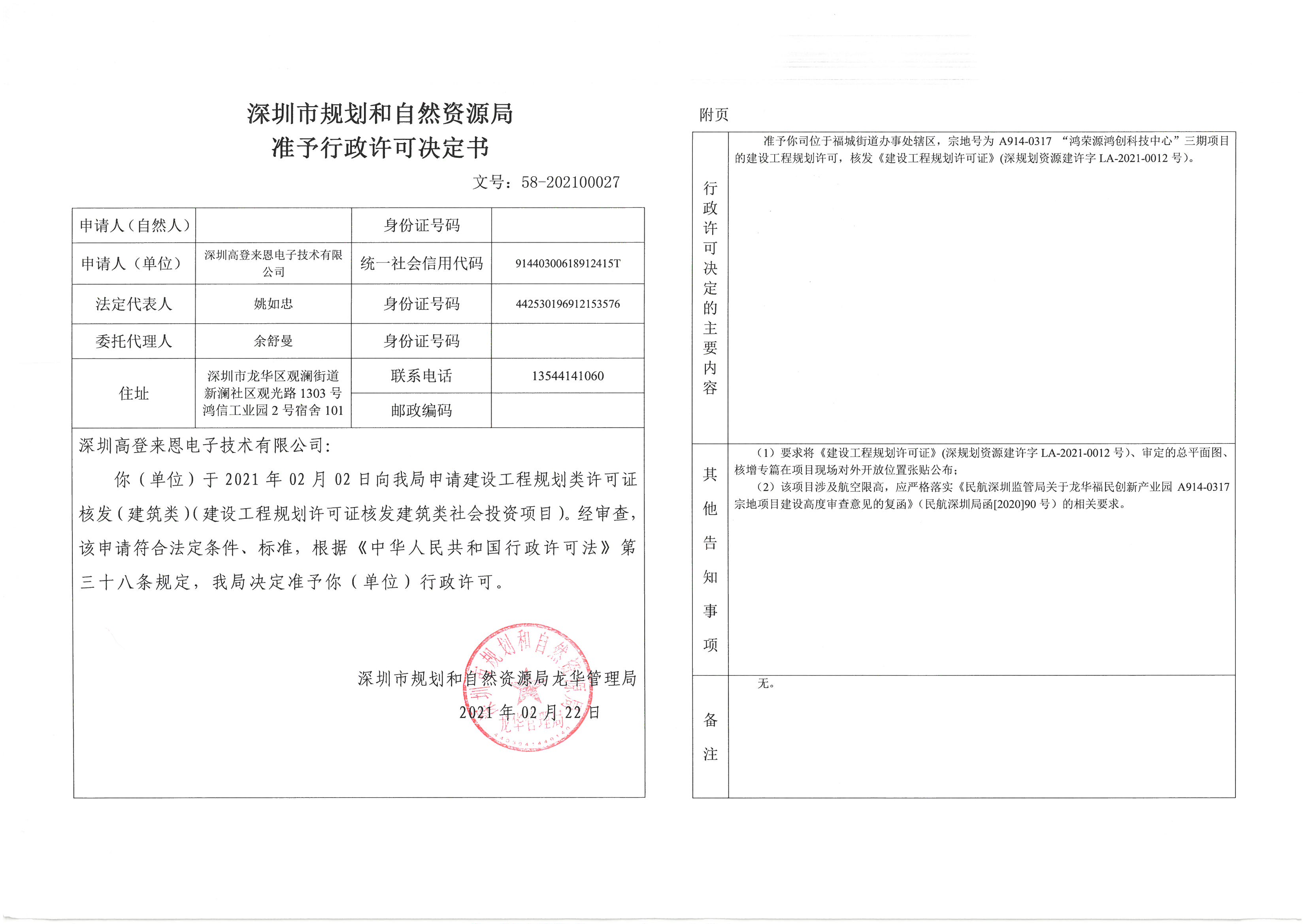 3.鸿荣源鸿创科技中心(宗地号:A914-0317)三期准予行政许可决定书