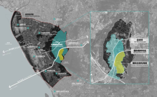 Jiuwei International Headquarters Area covers a land area of about 9k㎡. In the future, the area will focus on gathering functional and regional headquarters of enterprises, international organizations and institutions that have globalization strategies. The core region of the area is 4.6k㎡, including 2.6k㎡ of the International Headquarters Pilot Area ("Pilot Area") and 2.0 km2 of the International Service Block. The Pilot Area is the core bearing area for the deployment of headquarters and industrial functions. It is a scarce incremental space at the forefront of Shenzhen's bay-oriented development.