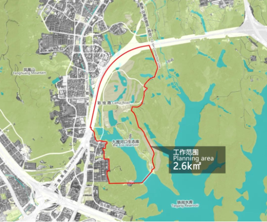 本次竞赛工作范围总面积约2.6平方公里,位于铁岗水库与凤凰山之间,西、北至沈海高速、东至福洲-沈海连接线(规划)-铁岗水库、南至九围河口生态库,基地中水系丰沛、植被茂密,独具山水相融的生态环境优势。