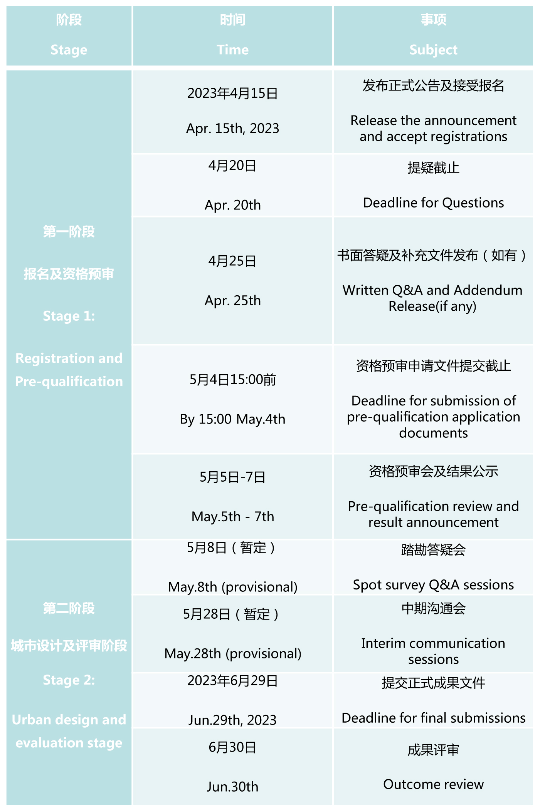 本次国际竞赛分为两个阶段进行:第一个阶段为报名及资格预审阶段,第二个阶段为城市设计及评审阶段。