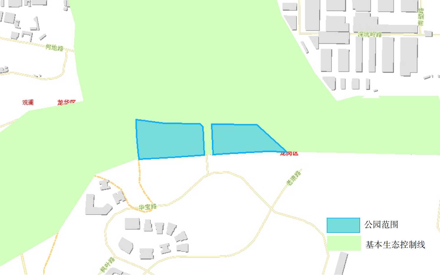 项目用地全部位于基本生态控制线范围内。根据《深圳市基本生态控制线管理规定》(深圳市人民政府令第145号公布 深圳市人民政府令第254号修正),公园属于允许在基本生态控制线内建设的范畴,现根据规定予以公示,具体范围详见附图。