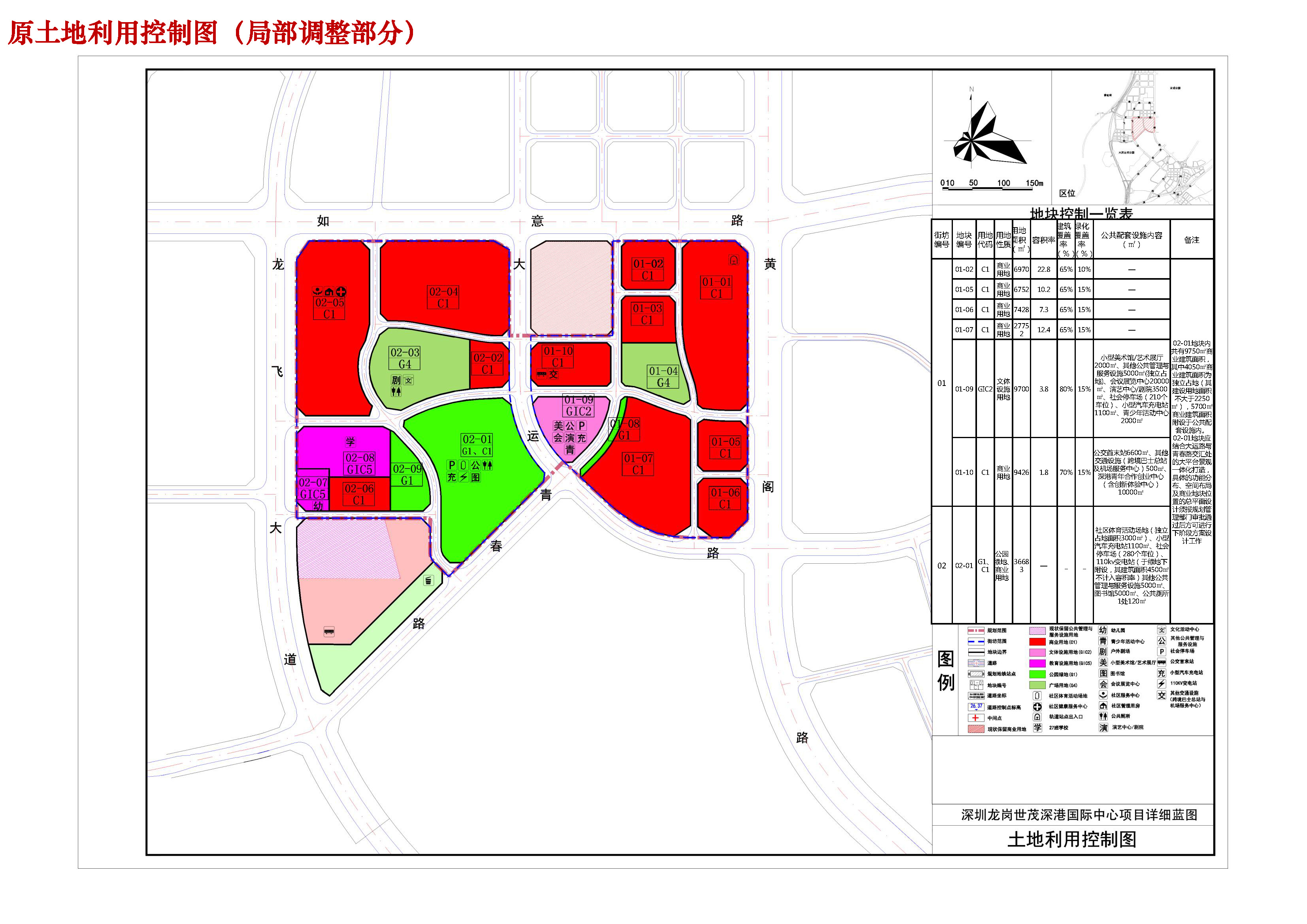 世茂深港国际中心项目位于青春路以北、黄阁路以西、龙飞大道以东、如意路以南,总用地面积321945.68平方米,其中建设用地面积196155.20平方米,绿地面积42416.53平方米,道路用地面积56712.59平方米,其他用地面积26661.36平方米。深圳市世茂新里程实业有限公司委托深圳市城市规划设计研究院有限公司编制了《深圳龙岗世茂深港国际中心项目详细蓝图设计》,因建筑设计深化需调整原已批详蓝,具体调整内容详见附件图表中红字部分。根据《中华人民共和国城乡规划法》和《广东省城市控制性详细规划管理条例》等相关规定,现就该调整成果予以公示。