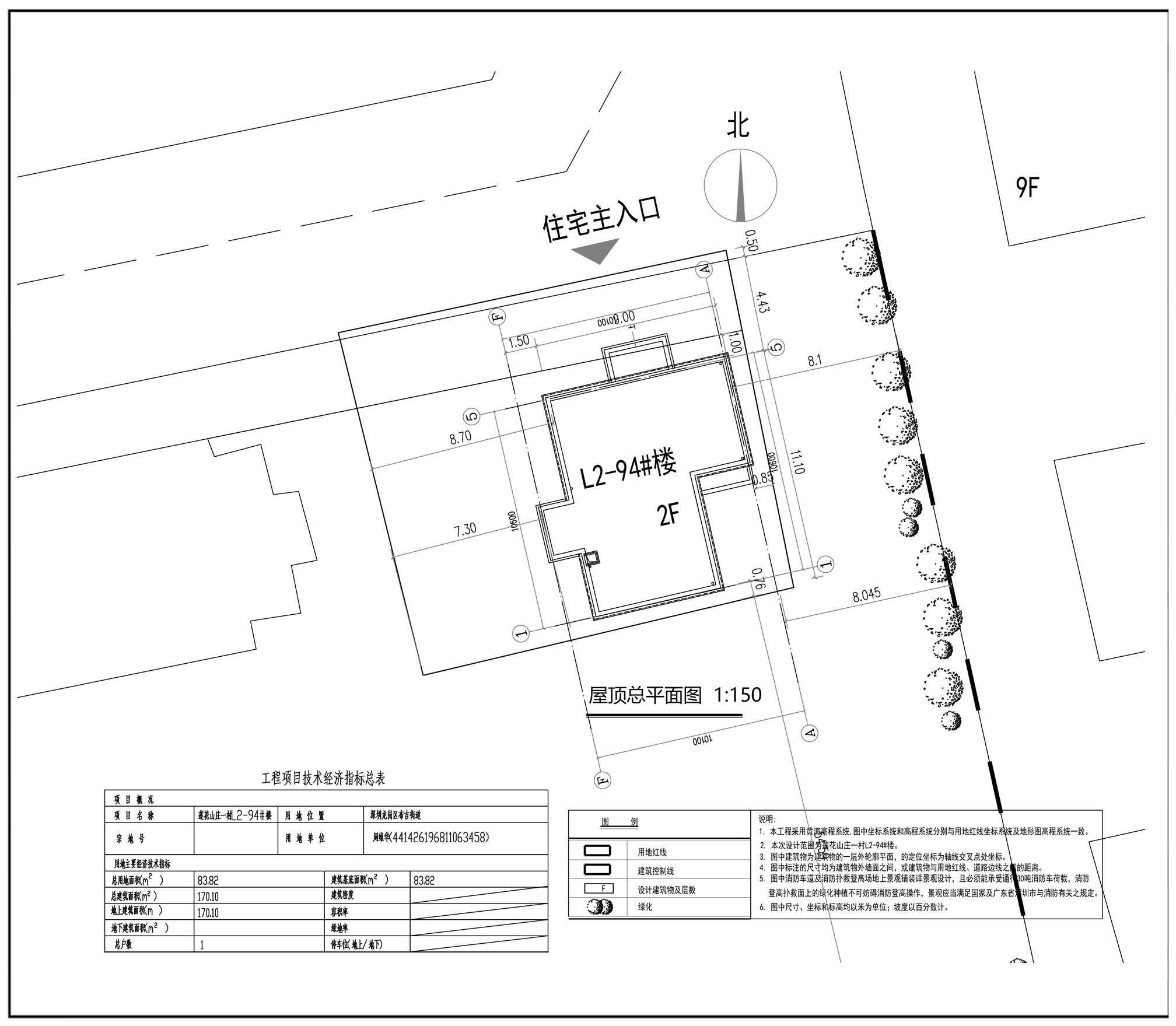 本次申报莲花山庄一村L2-94号住宅2层,建筑面积170.10平方米(住宅),建筑高度6.8米,建筑面积与房产证面积一致。所报方案设计文件在总平面图中位置,符合龙布街函[2016]380号《关于报送莲花山庄李振仪等10栋房屋拆除情况的函》的相关坐标要求,方案设计布局、建筑色彩、立面设计、建筑风格等与原批准基本一致,基本满足相关规范要求。