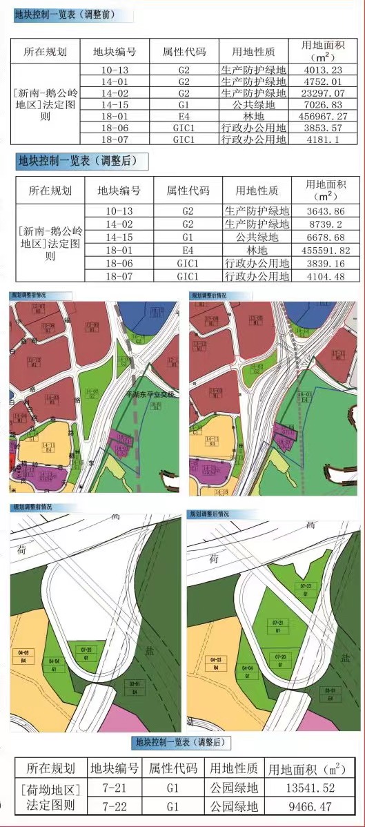 [新南-鹅公岭地区]法定图则10-13地块369.37平方米生产防护绿地调整为道路用地,剩余3643.86平方米仍保留为生产防护绿地;14-01地块生产防护绿地全部调整为道路用地,面积为4752.01平方米;14-02地块14558平方米生产防护绿地调整为道路用地,剩余8739平方米仍保留为生产防护绿地性质;14-15地块规划用地性质为公共绿地,其中348.15平方米由公共绿地调整为道路用地,剩余6678.68平方米仍为公共绿地;18-01地块用地性质为林地,其中1375.45平方米调整为道路用地;18-06地块用地性质为行政办公用地,其中14.42平方米调整为道路用地,剩余3839.15平方米仍为行政办公用地;18-07地块用地性质为行政办公用地,其中76.63平方米调整为道路用地,剩余4104.47平方米仍为行政办公用地。为保障城市绿地不减少,将[荷坳地区]法定图则中的一处道路用地调整为公共绿地,调整后地块编号为7-21(G1)、7-22(G1),面积分别为13541.52平方米、9466.47平方米。