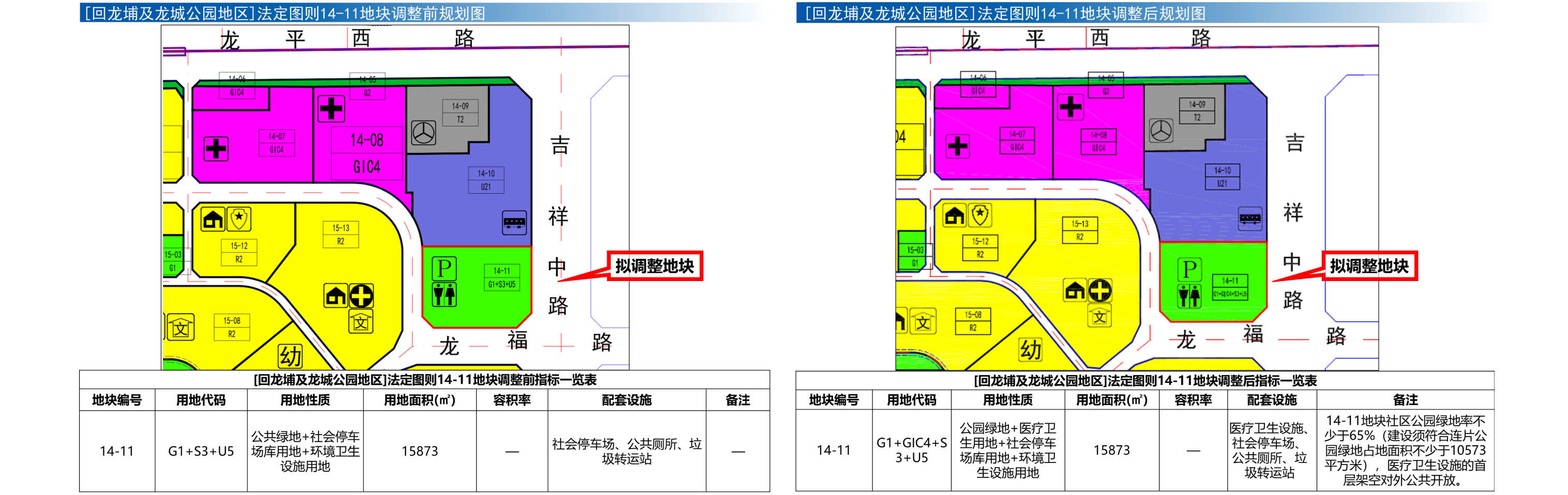 本次调整后[回龙埔及龙城公园地区]法定图则14-11地块,用地面积为15873平方米,规划用地性质为公园绿地(G1)+医疗卫生用地(GIC4)+社会停车场库用地(S3)+环境卫生设施用地(U5),规划配套医疗卫生设施、社会停车场、公共厕所、垃圾转运站。备注:14-11地块社区公园绿地率不少于65%(建设须符合连片公园绿地占地面积不少于10573平方米),医疗卫生设施的首层架空对外公共开放。