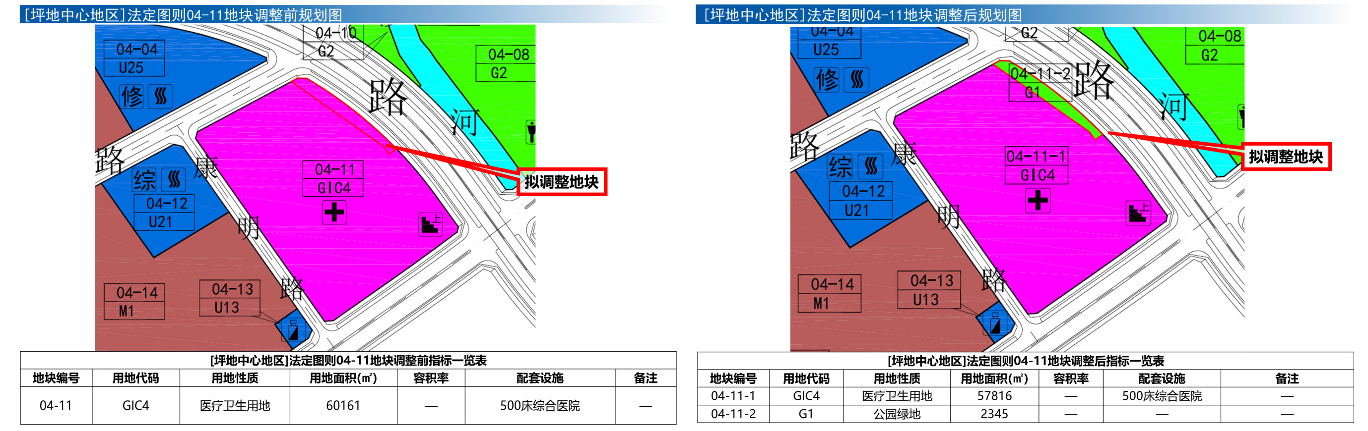 本次调整拟将地块分为[坪地中心地区]法定图则04-11-01、04-11-02地块,其中[坪地中心地区]法定图则04-11-01地块用地面积为57816平方米,规划用地性质为医疗卫生用地(GIC4),规划配套设施500床综合医院;[坪地中心地区]法定图则04-11-02地块,用地面积为2345平方米,规划用地性质为公园绿地(G1)。