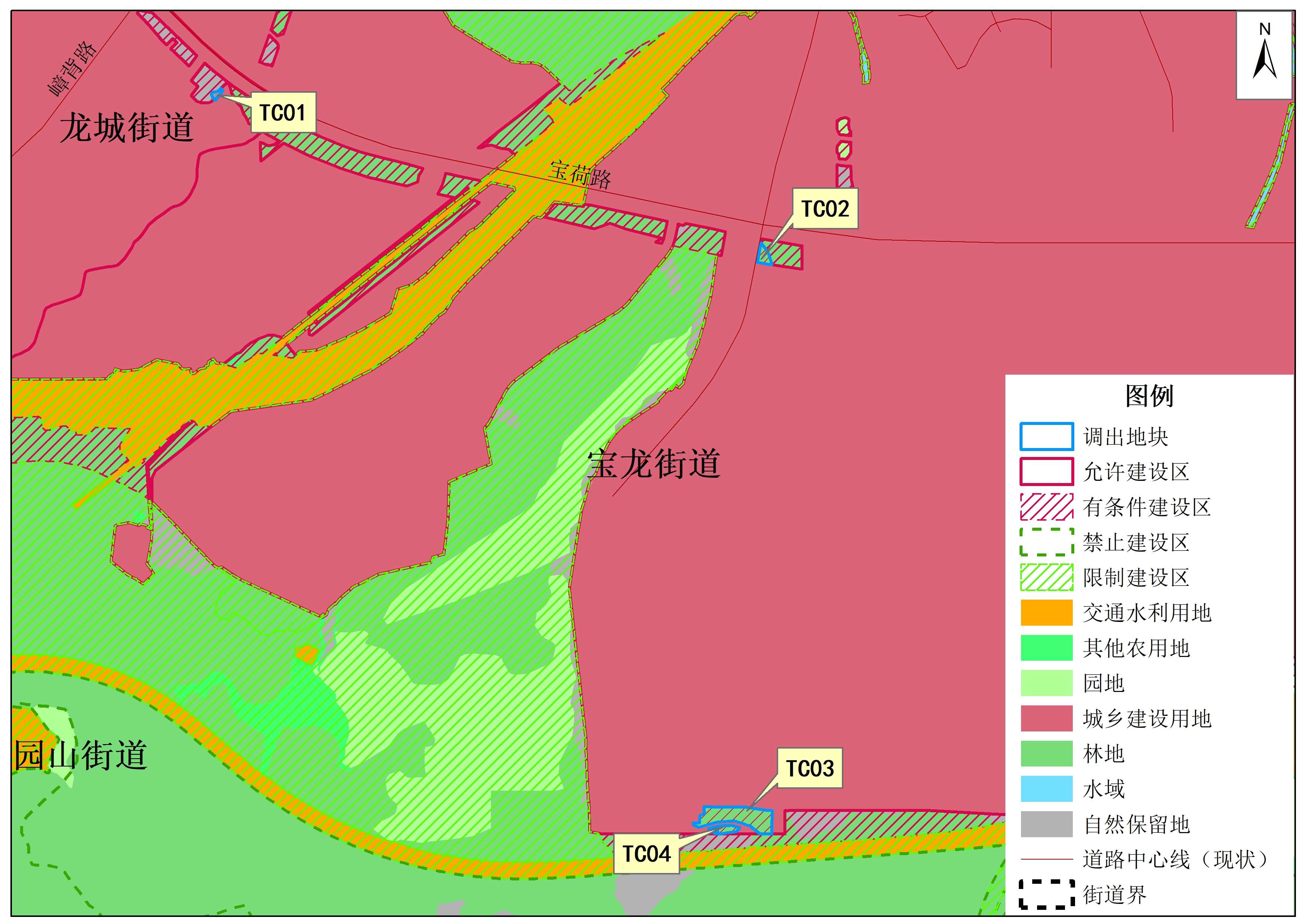 二、调出地块4块,面积共为8819.64平方米,其中调出地块01位于龙城街道爱联社区,宝荷大道南侧,面积305.42平方米;调出地块02位于宝龙街道宝龙社区,宝荷大道南侧,面积909.14平方米;调出地块03、04位于宝龙街道宝龙社区,东部高速公路北侧,调出地块03面积6758.61平方米,调出地块04面积846.47平方米。根据《深圳市土地利用总体规划(2006-2020)》,调出地块土地利用总体规划空间管制分区均为允许建设区,土地利用总体规划用途均为城乡建设用地。经核查深圳市2018年土地利用变更调查,调出地块01土地利用现状用途为农用地(有林地);调出地块02土地利用现状用途为农用地(农村道路)398.61平方米、未利用地(其他草地)510.53平方米;调出地块03土地利用现状用途为农用地(有林地)1780.78平方米、未利用地(裸地)4977.83平方米;调出地块04(TC04)土地利用现状用途为未利用地(裸地)。经实地调研,调出地块01现状主要为林地和林地护坡;调出地块02现状为林地;调出地块03、04现状主要为林地护坡。根据[南约地区]法定图则修编,调出地块01、02、03、04规划用地性质为农林和其他用地(E2)。经核查,调出地块不涉及历年农用地转用方案、农用地转用实施方案、选址意见书和全市用地方案图,未经批准为建设用地,未办理相关用地手续。