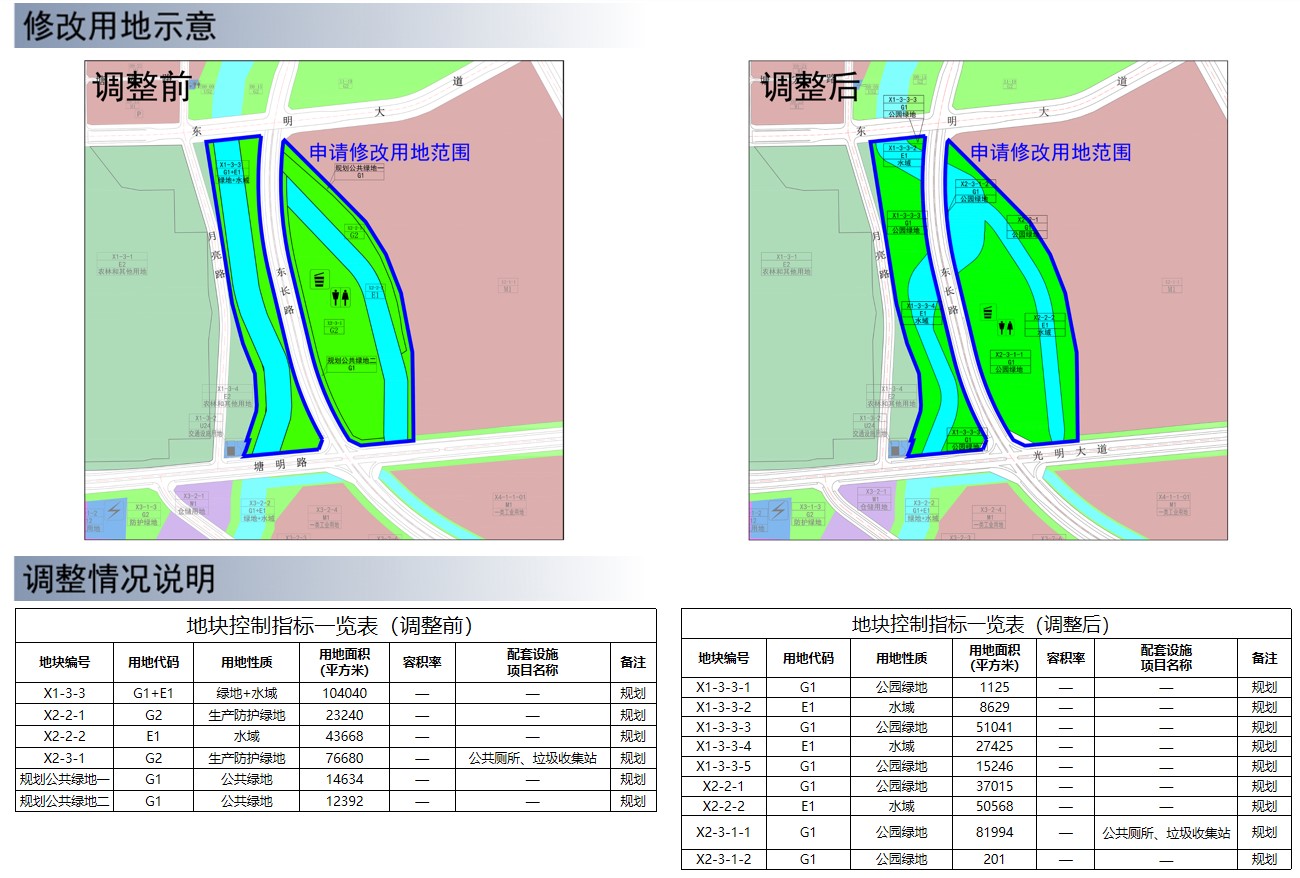 结合水域及道路线位优化调整其两侧绿地地块、东长路与东明大道交叉口南侧、东长路与光明大道交叉口北侧边界并核定用地面积,用地性质按《深标》表述相应调整为公园绿地(G1)、水域(E1),其他规划条件不变;调整后将地块南侧市政道路结合道路命名落实为光明大道,道路宽度和等级不变。调整后各地块规划指标如下: