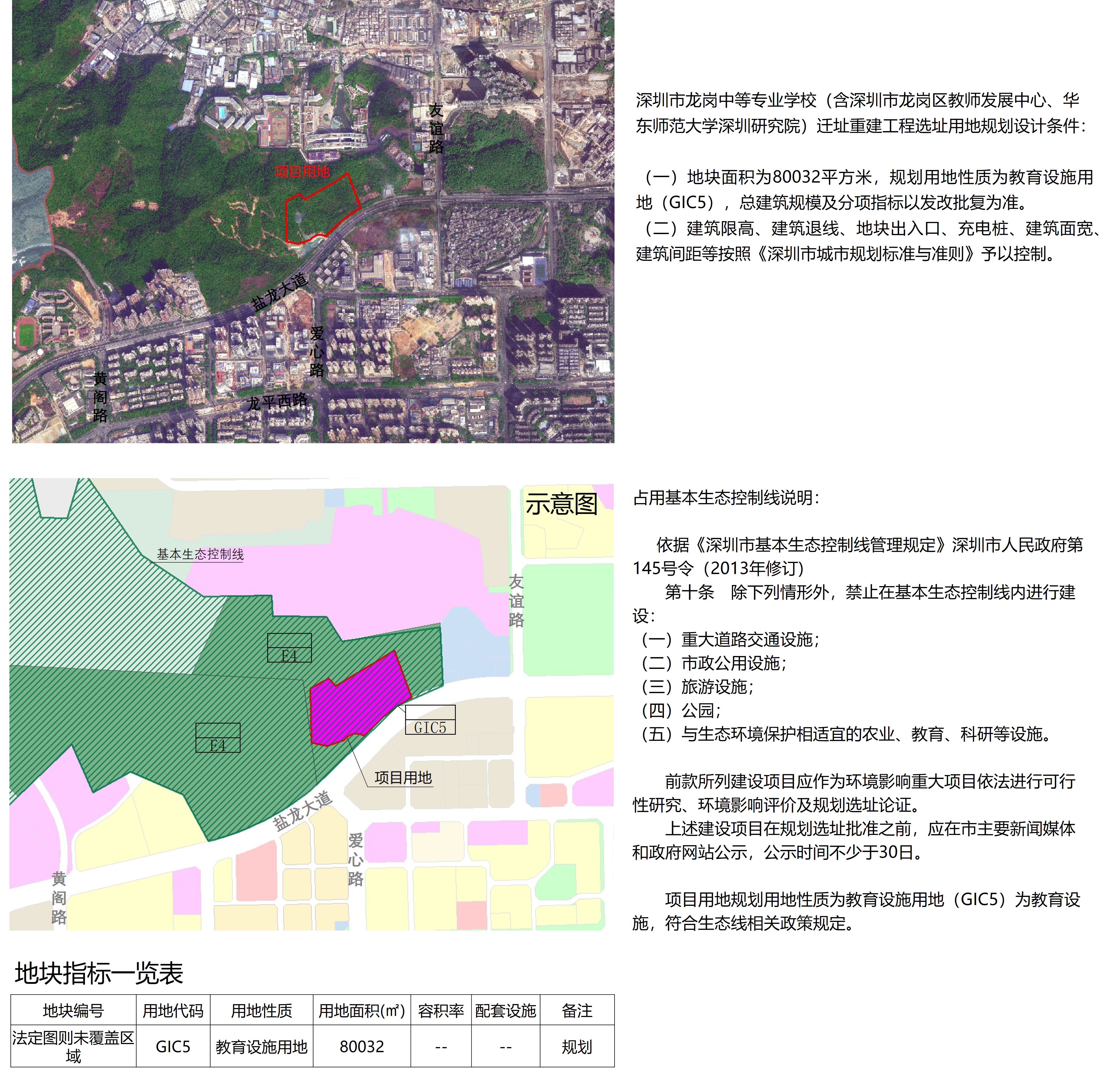 由于现状龙岗中等专业学校(含深圳市龙岗区教师发展中心)所在片区发生房屋、地面沉降险情,为保障广大师生的人身安全及教学工作的安全开展,经龙岗区政府同意迁址重建,龙岗中等专业学校、深圳市龙岗区教师发展中心、华东师范大学深圳研究院一并选址建设。选址用地规划设计要点已经市规划和自然资源局业务会审议并原则通过,根据《中华人民共和国城乡规划法》《广东省控制性详细规划管理条例》《深圳市城市规划条例》和《深圳基本生态控制线管理规定》等相关规定,现对选址用地规划设计条件及基本生态控制线占用情况公示如下: