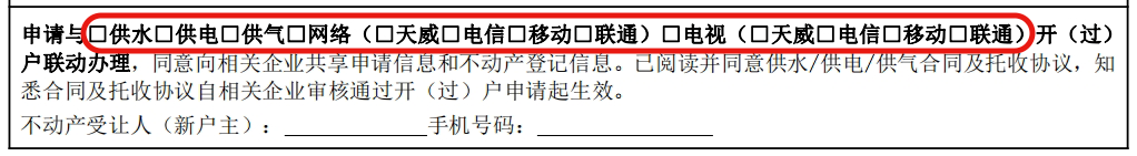 目前,企业群众在申请办理不动产转移登记的同时,若存在同时办理供水、供电、供气、电视、网络开(过)户业务的需求,无需额外提交任何材料,仅需在受理不动产转移过程中在不动产登记申请表勾选具体办理的民生事项,即可同时完成相关民生服务的受理。