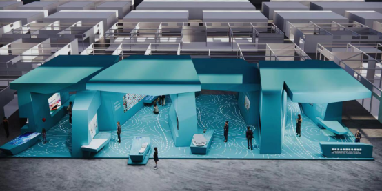 “百舸争流,奋楫者先”。深圳渔业发展建设规划展空间设计提取“百舸争流”的视觉特征,在整体平面上勾勒出船只络绎不绝、错落前行的恢弘动势,并由此延伸出整体空间效果,体现深圳打造现代渔业高质量发展中心城市、国际海洋城市的先行者精神,也与本届渔博会“渔粤向未来”的主题相呼应。整体造型以礁石为概念原型,通过梭形墙体打造巨石感构筑物,辅以沉浸式水波纹投影,营造出在水底沉浸式漫游的独特观展体验。