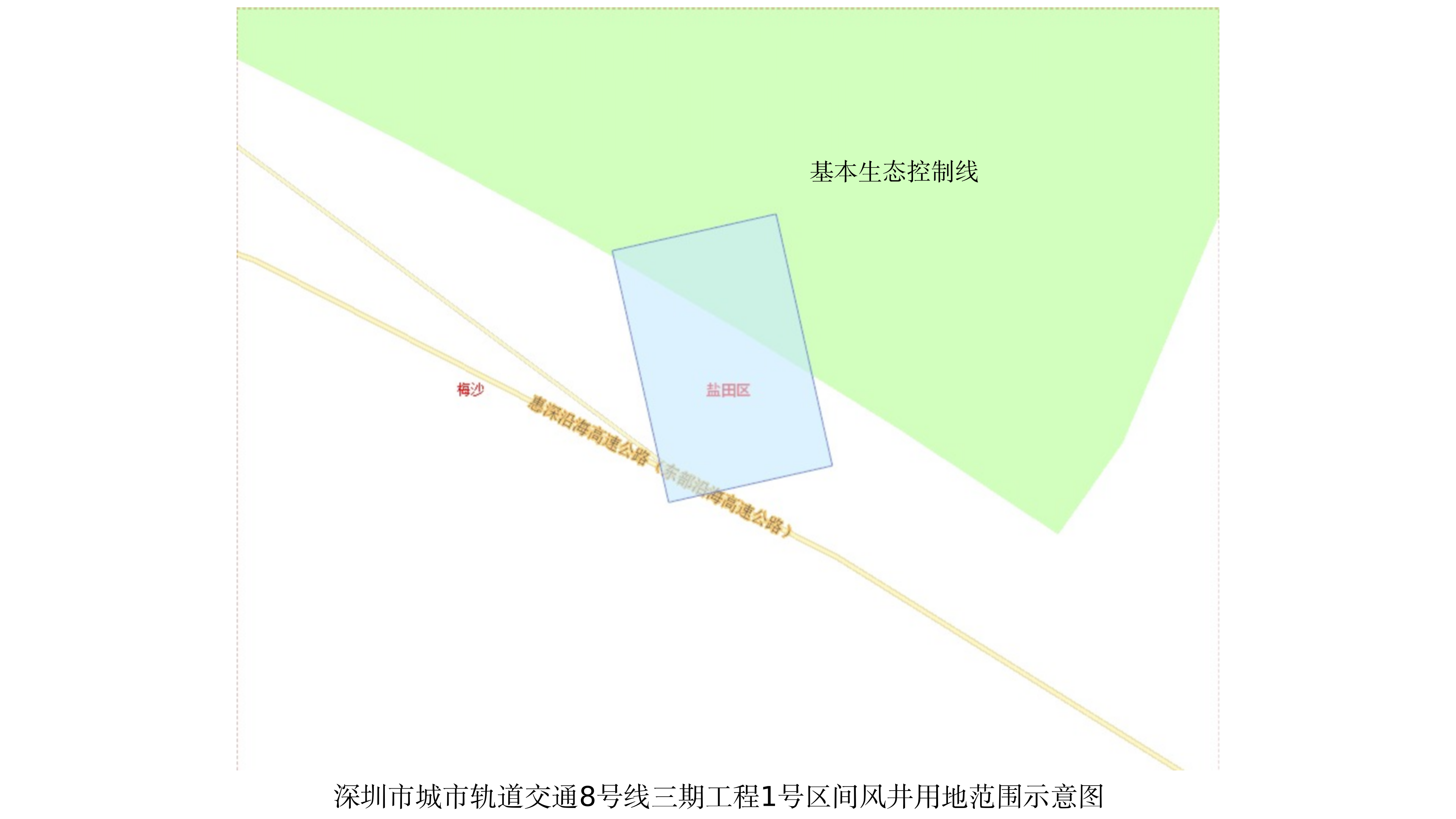 根据市、区政府有关工作部署,我局正在开展深圳市城市轨道交通8号线三期工程1号区间风井建设项目前期工作,该地块拟用地范围位于盐田区梅沙街道,项目地面层用地面积243.70平方米,拟使用地下空间2139.31平方米。经核查,该地块涉及基本生态控制线约193.07平方米。