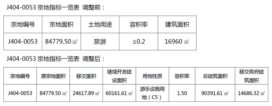 根据《关于规范已出让未建用地土地用途变更和容积率调整的处置办法》(深府办规〔2019〕3号)第五条、第十条规定,J404-0053宗地无偿移交城市道路用地及公园绿地用地面积为24617.89㎡;剩余60161.61㎡用地由深圳市海洋世界有限公司继续开发建设,用地性质为“游乐设施用地(C5)”,总建筑面积为90391.61㎡,其中无偿移交政府用于商业性办公用房的建筑面积为14686.32㎡。