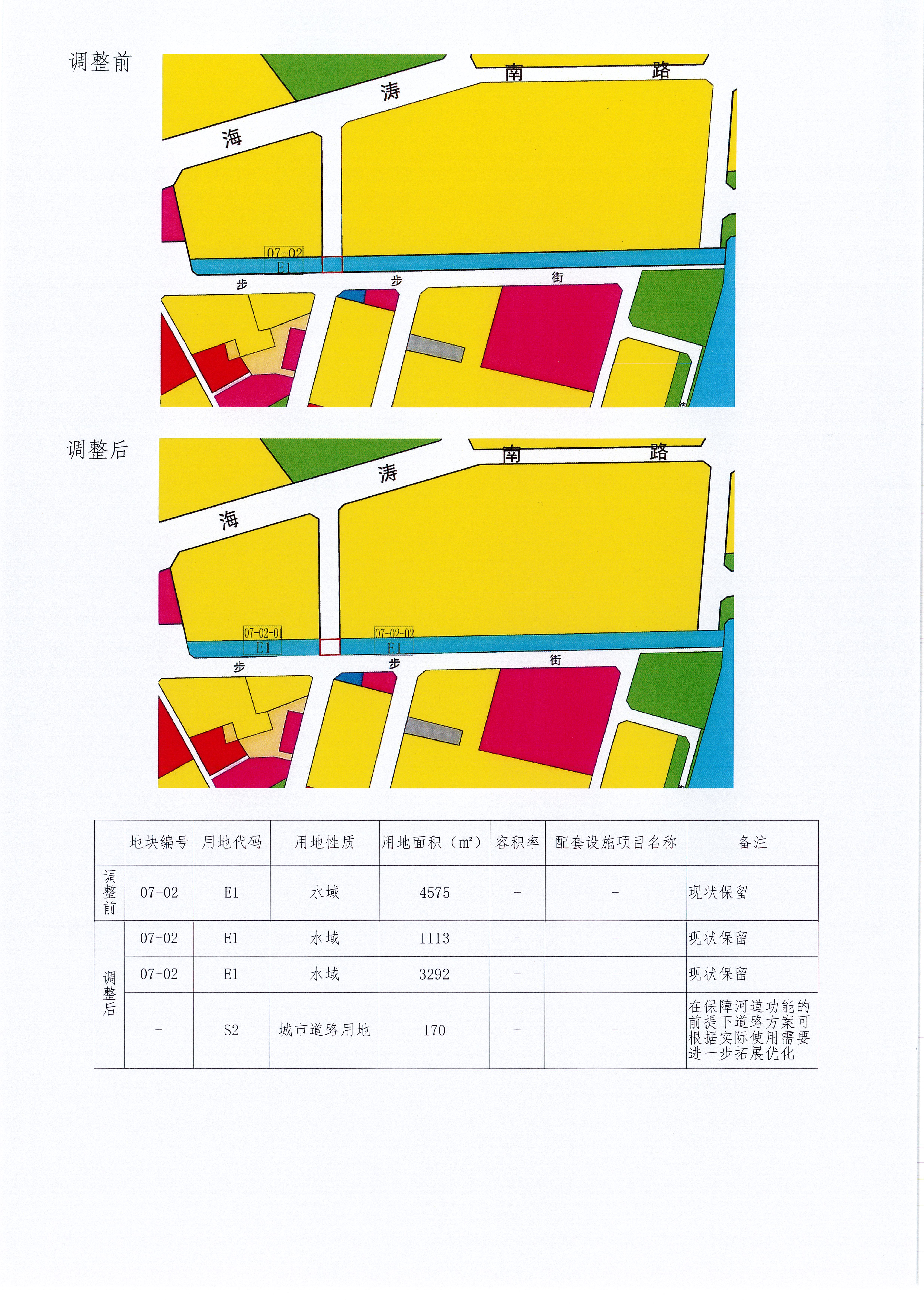 其中,07-02-01地块规划用地面积为1113㎡,其余指标不变;07-02-02地块规划用地面积为3292㎡,其余指标不变;城市道路用地规划用地面积为170㎡,备注“在保障河道功能的前提下道路方案可根据实际使用需要进一步拓展优化”。