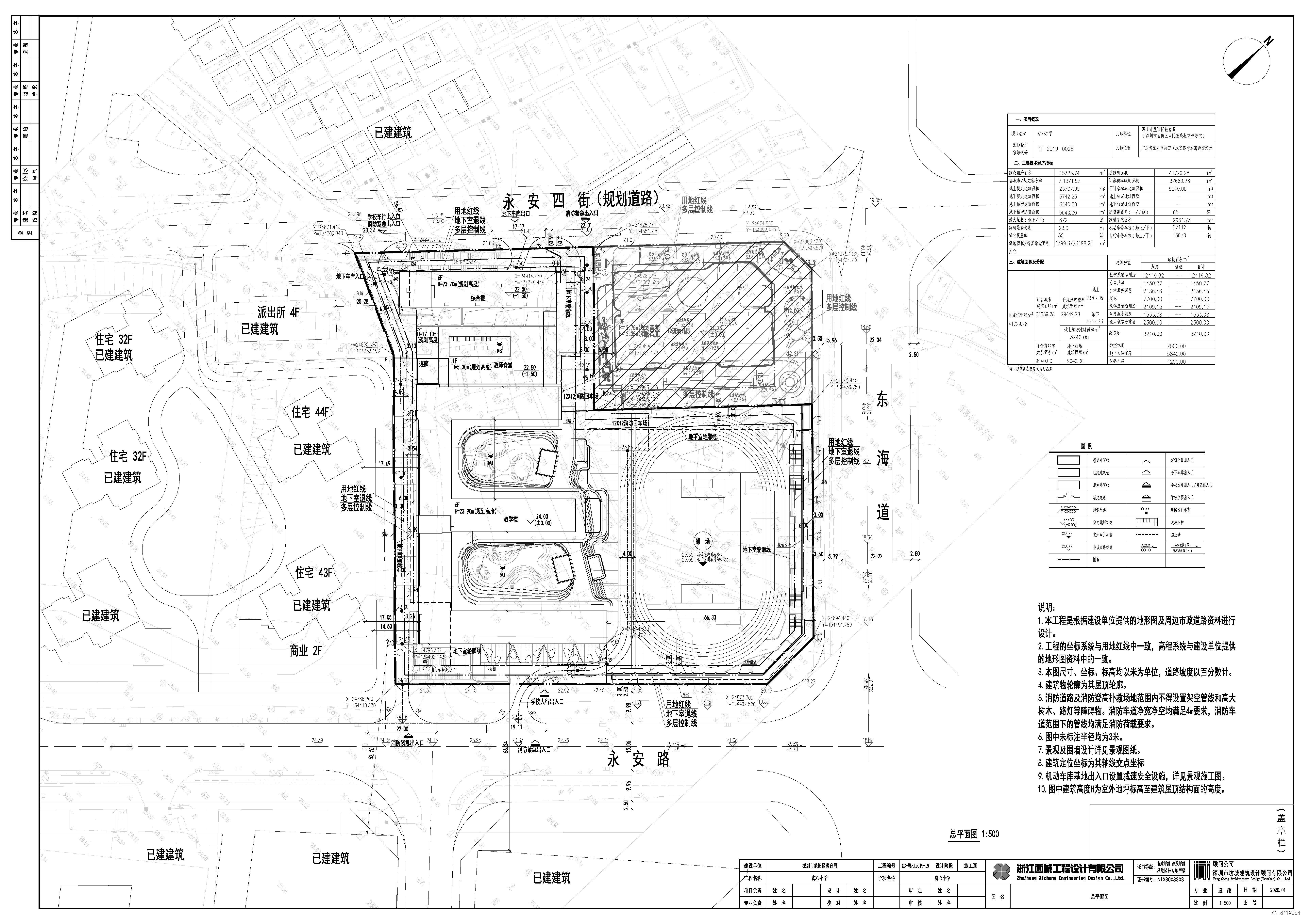 海心小学项目位于盐田区永安路与东海道交汇处,建设用地面积15325.74㎡,土地用途为教育设施用地,允许建设规定建筑面积29449.28㎡,其中,教学及辅助用房14528.97㎡,办公用房1450.77㎡,生活服务用房3469.54㎡,全天候综合球场2300㎡,其他7700㎡。