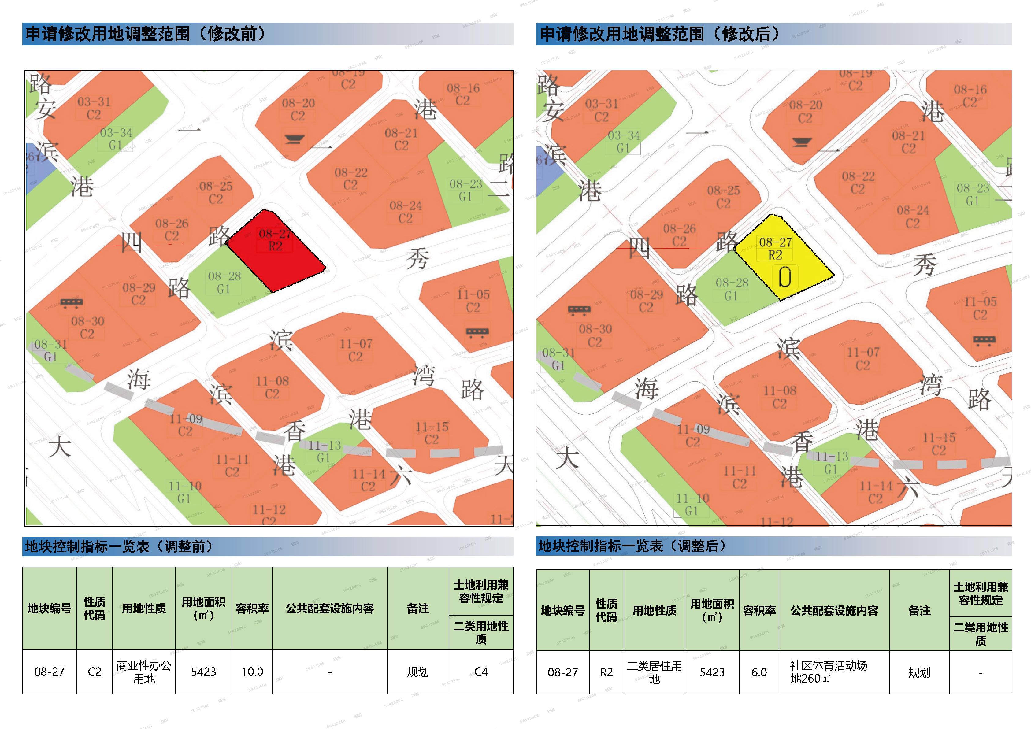 08-27地块规划用地性质调整为二类居住用地(R2),用地面积为5423平方米,容积率6.0,配套设施为社区体育活动场地260平方米,备注“规划”。