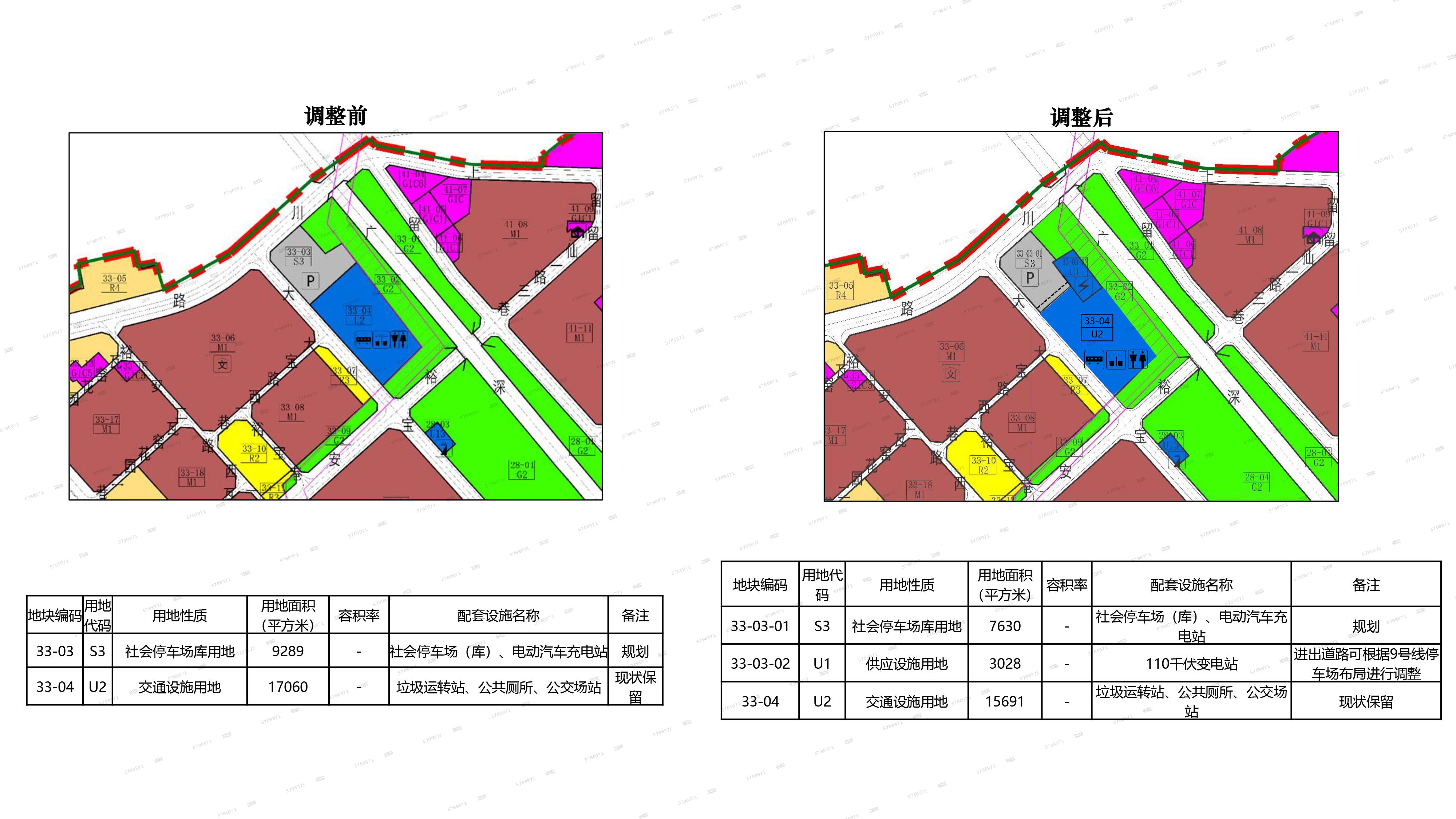 33-03-02地块用地性质为供应设施用地(U1),配套设施项目名称为110千伏变电站,面积3028平方米,备注为进出道路可根据9号线停车场布局进行调整。
