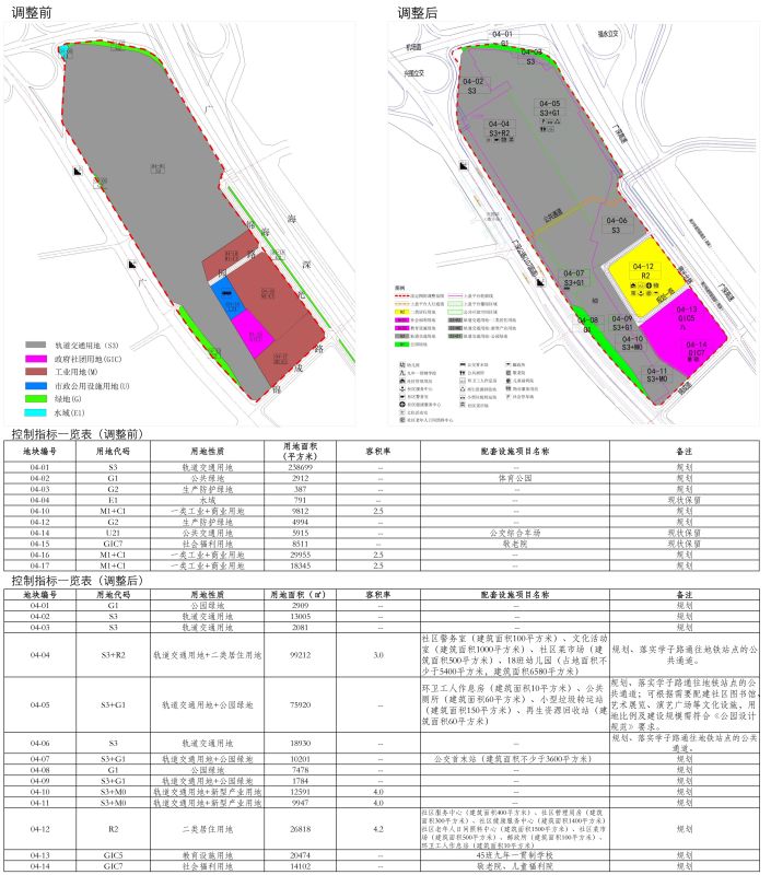 以上规划调整情况详见调整前后地块规划控制指标一览表及附图。