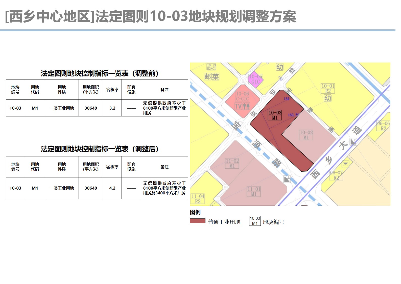 调整后,10-03地块用地面积为30640.33平方米,规划用地性质为一类工业用地(M1),容积率“4.2”,备注为依据政府批件,无偿提供政府不少于8100平方米创新型产业用房及3400平方米新建厂房。